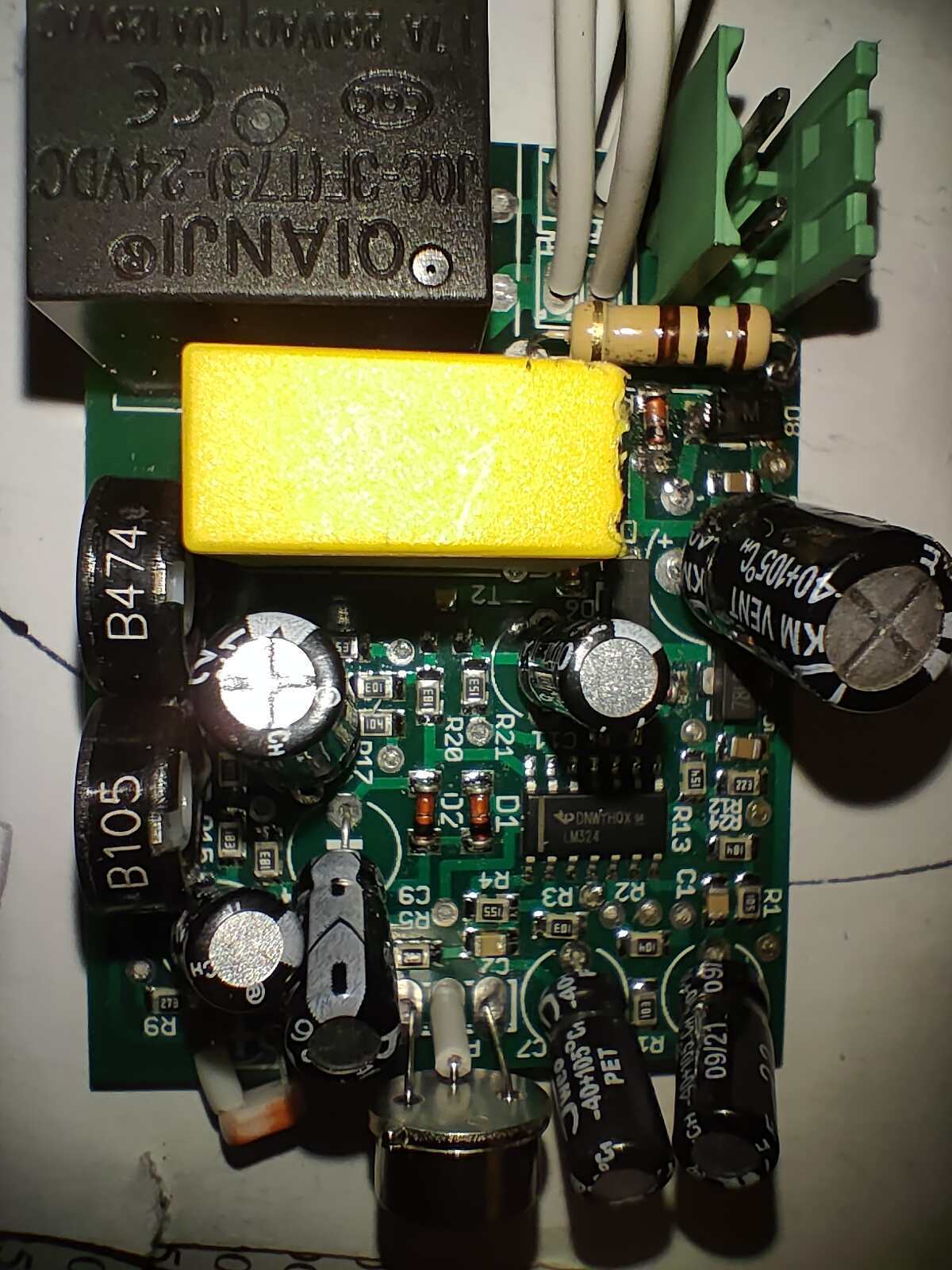 Nem jutottam sehova. Kicseréltem a kondenzátort (volt itthon egy kapcsoló óra, amiben pont ilyen kondenzátor volt.) de semmi nem változott. Az LM7805 előtt ugyanúgy 1-1,6v-ot mérek. Saját táppal nem, de külső táppal továbbra is működik a PIR szenzoros áramköri rész. Közben megnéztem, hogy a lámpákat egy 24v-os relé kapcsolná és a külső táppal azért nem húz meg, mert valószínűleg kevés neki a feszültség. Hogy miért nincs rendes táp, az ezek után számomra talány.