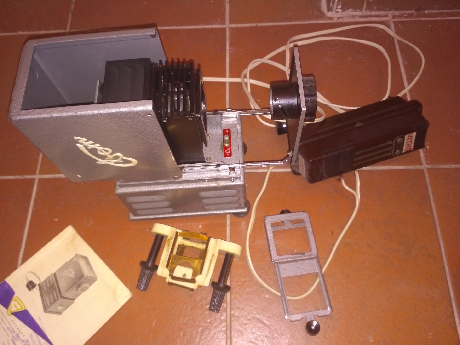 Nekünk is van valami hasoló, szintén szovjet diavetítő. A képeden kissé szét van esve/szedve, de amúgy nem olyan bonyolult: mikor össze van rakva, egy kettős fém keret szolgál a diák tartására, tehát egyik diát cserélheted a következőre, miközben az előző még bent van a vetítőben, betoláskor az ellentétes oldalon fogja kiadni a bent lévőt, amit szintén cserélhetsz, míg a másikat mutogatod...