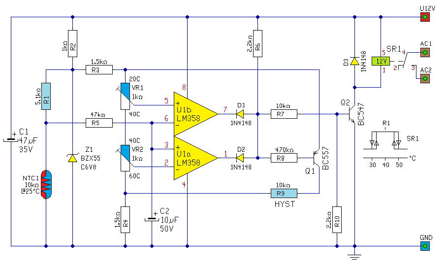 Én itt 40 fokra vettem a középértéket. De ha Te 25..35 között szeretnéd, akkor az R1-et 8,2k-ra kell választani. (Mindig annyira, mint a középhőmérsékleten a termiszor ellenállás értéke..) Ha pedig az átfogási sávot csökkentenéd, akkor az R2 és R4-et 2,2k-ra. A hozzászólás módosítva: Jan 30, 2023