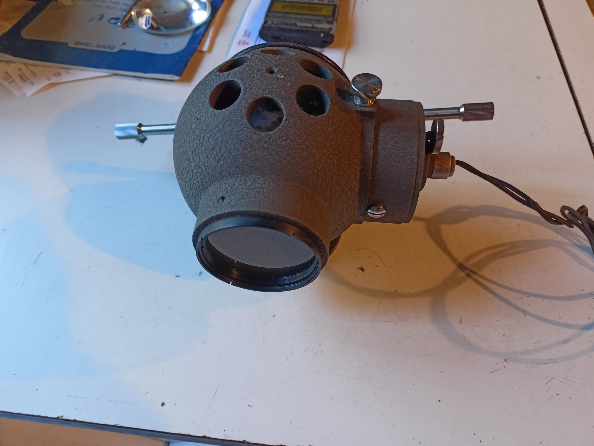 Az eredeti 6 V-os izzóhoz használt feszültségtranszformátorral együtt. Mindegyik azonos Gat1 fémből készült. A készülék működőképes és feszültség alatt tesztelt.