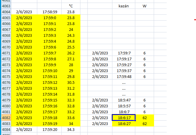 Nem volt indokolatlan a nejem részéről a reklamáció: a példában 17:59:02-kor elindul a víz, a kazán pedig rá se hederít, csak 18:06:17-kor veszi észre, hogy dolga van. Bő 7 perc alatt pedig rengeteg melegvíz távozik a tárolóból, ezért nem csoda, hogy átmenetileg lehűl.