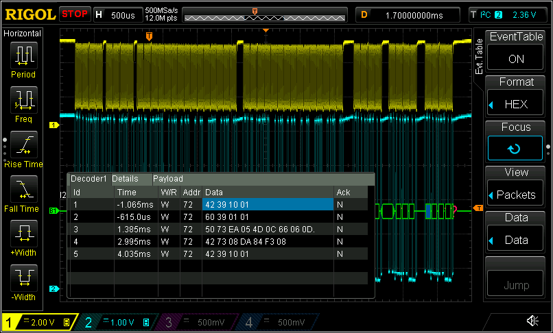 A digitális szkópok manapság fel vannak erre készülve, tartalmaznak protocol decodert, amivel nem csak a hullámformát nézheted meg, hanem az elküldött byte-okat dekodolva, illetve akár csomag szinten is egy event táblában.