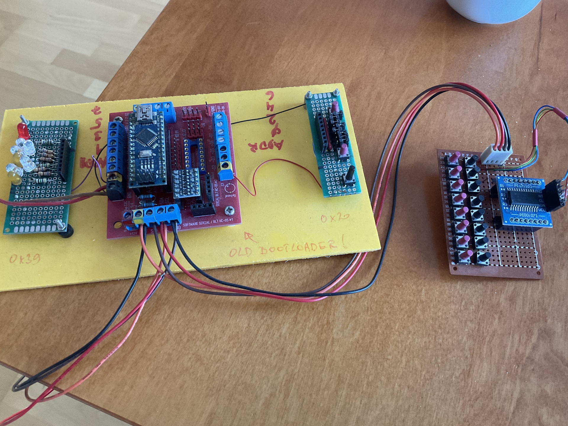 A kép jobboldalán láthatod, hogy egy PCF-el 16 nyomogombot kezelek ( 8 piros, meg 8 fekete) és ha jol emlékszem 8 ilyen modult lehet az arduinora akasztani ( ennyi cim van ).