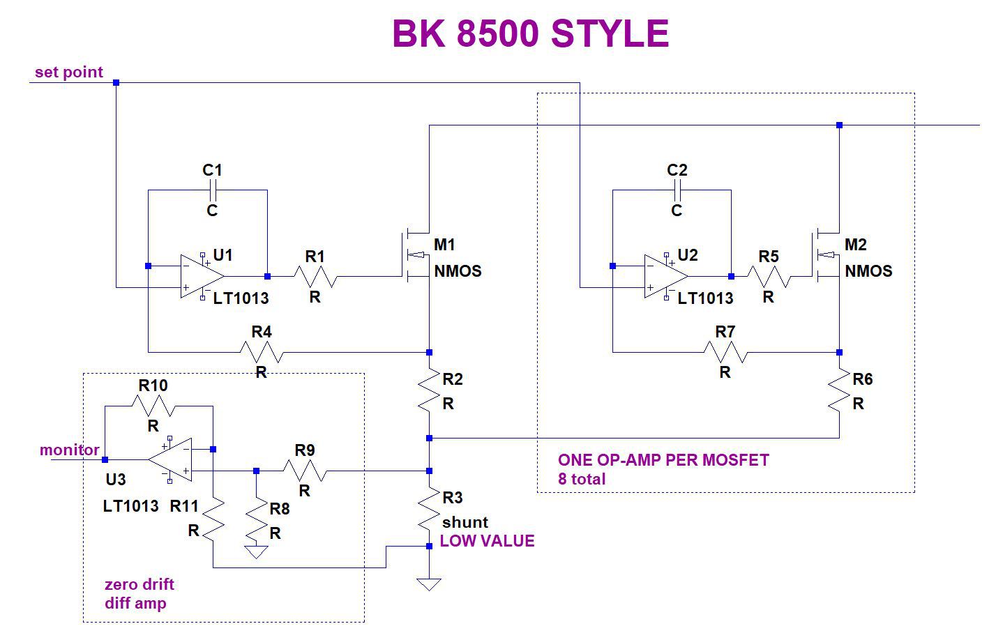 Jó ötlet télire a kísérlet, körülnézek hogy találok-e valami erősebb "Constant Current" LED trafót, azzal meg tudnám csinálni én is: Fölfeszítenék pár MOSFET -et füzérbe GND=Source1; Gate1=Drain1=Source2; Gate2=Drain2=Source3; Gate3=Drain3=Vdd elrendezésben, aztán hadd fűtse a garázst tavaszig! A 0.1 ohm választását önmagában nem akartam kritizálni, természetesen megfelelő a méréshez, mikor pont a különbözőséget akarjuk kiemelni/kidomborítani. Azonban ha egy készülékben elsimítani/kiegyenlíteni szeretnénk a MOSFET -ek eltérését, akkor valahová 10 ohm környékére tippelnék: Ezt a szerepet jól ellátja MOSFET -enkét egy-egy műveleti erősítő 80dB nyílt hurkú DC erősítéssel, az mindjárt 100 ohm fölé lövi ki a "simítóhatást". Az Ágotában csücsülő MOSFET a névleg 3 amperes csúcsáramát milyen gyakran látja, jó esetben szökőévente? Audió alkalmazáshoz nem nagyon tudok hozzászólni, az én szemem előtt "kormika" fórumtárs által felvázolt műterhelés állandó és folyamatos DC árama lebegett. Másik ugyanilyen példa lehet egy áteresztő üzemű táp (pl: proli007-LPSU3A50V ) ezekben valószínűleg érheti állandó 3 amperes "EPROM-égető" öregítő hatás a MOSFET -et.