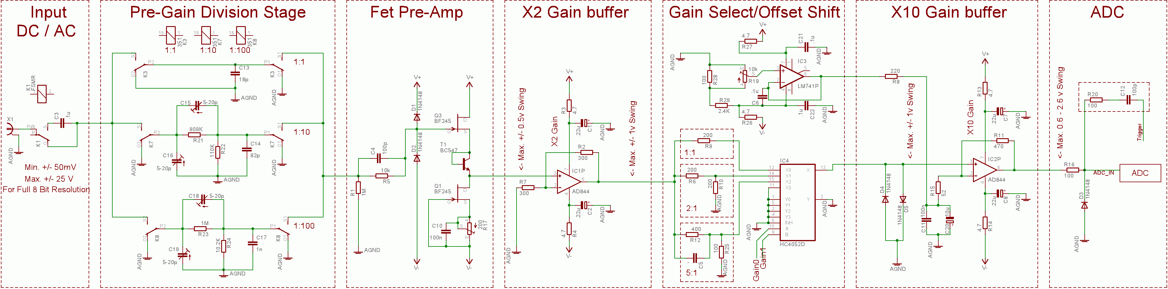 Meg sem tudom becsülni mikor lesz kész a teljes áramkör. Sok hónap. Szerettem volna hogy könnyen utánépíthető legyen, de ez nem fog menni, mert bontott 64K-s SRAM-ok (486-os PC-ből) lesznek benne és RESZ49-es relék. (4db. kell ebből HAM Bazár). Csatoltam az analóg talált kapcsolást. Van benne néhány gyanús rész. bemeneten 1µF -> a sávszélességet valószínűleg igen csak lekorlátozza. az IC utáni osztóban a néhány 100ohmos ellenállások -> kb. ekkora a 74HC4052-nek is az átmeneti ellenállása, ami a hőfoktól és tápfesztől is nagymértékben függ.