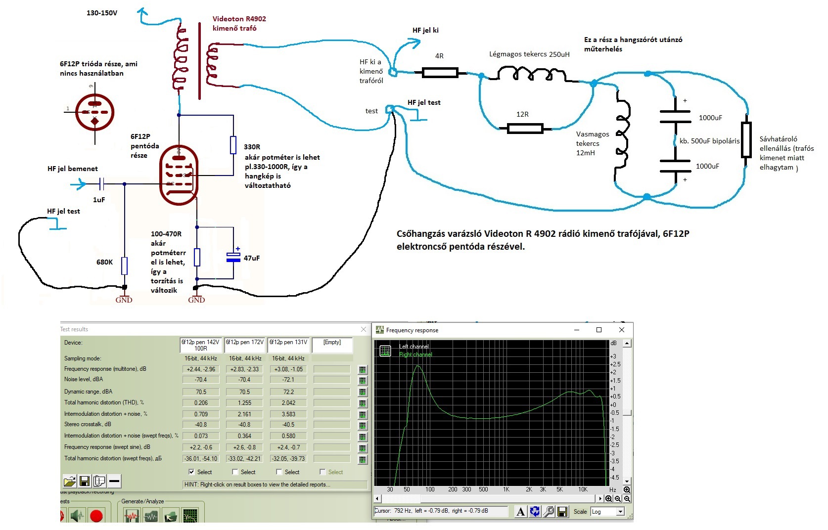 Sziasztok, jelzem mire jutottam a Videoton R4902-es kimenőtrafós - hangszóró műterheléses csőhangvarázslóval. Végül egy 6F12P pentóda része lett a meghajtó, tovább nem küzdök vele, ez a trafó kb. ennyit tud.