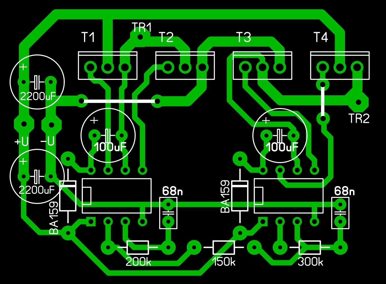A hangpanelen viszont azt csináltam - ma már szerintem nem így közelíteném meg -, hogy a bemenő tápcsatlakozónál és a puffereknél van egy föld-sziget, ill. az egyes csövek körül, és a korrekciós hálózatnál még külön-külön másikak. Ezek sajnos nem igazán csillagpontosan csatlakoznak a pufferek negatívjaihoz..