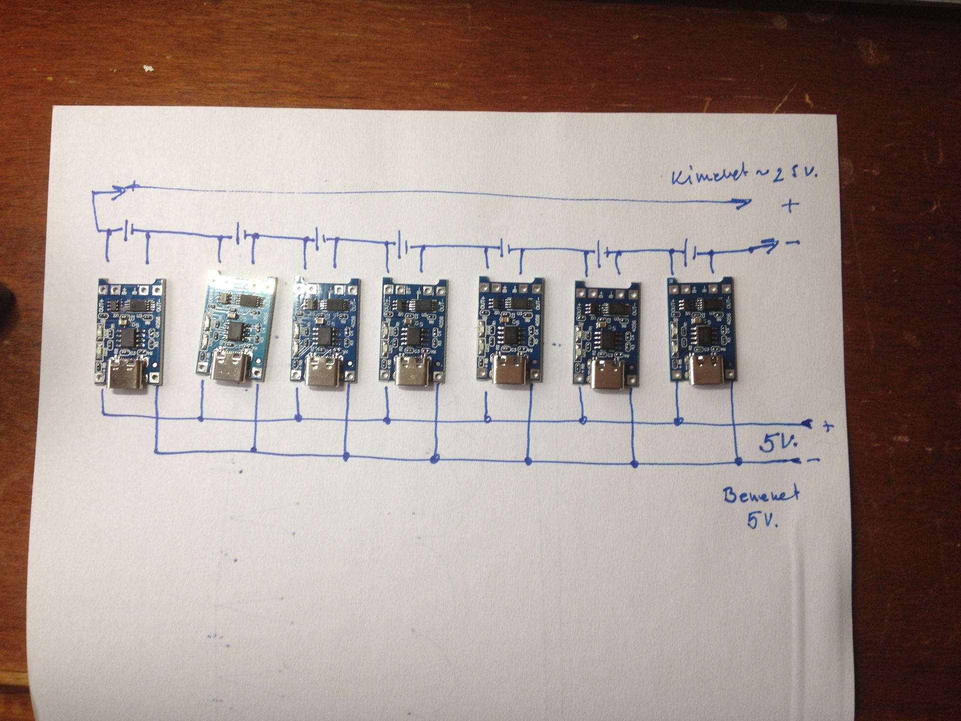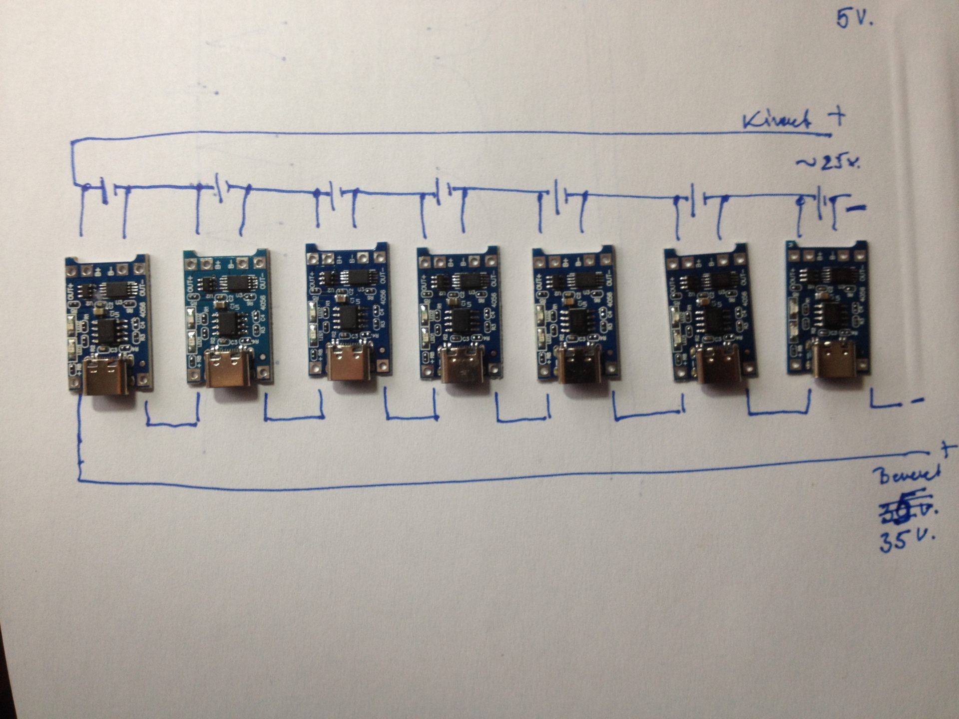 egy Bosch vezeték nélküli porszívó 7 db 18650-es akkuval, 25,2 V-on működk. Működni működik, de nem tölt, a vezérlő panel töltő része elhalt. Nincs 7 db. akkuhoz való BMS-em, ezért szeretném a töltést egyedi töltésfigyelővel megoldani. Kérdezem, hogy a mellékelt "rajzokon" lévő megoldás egyike működhet-e?