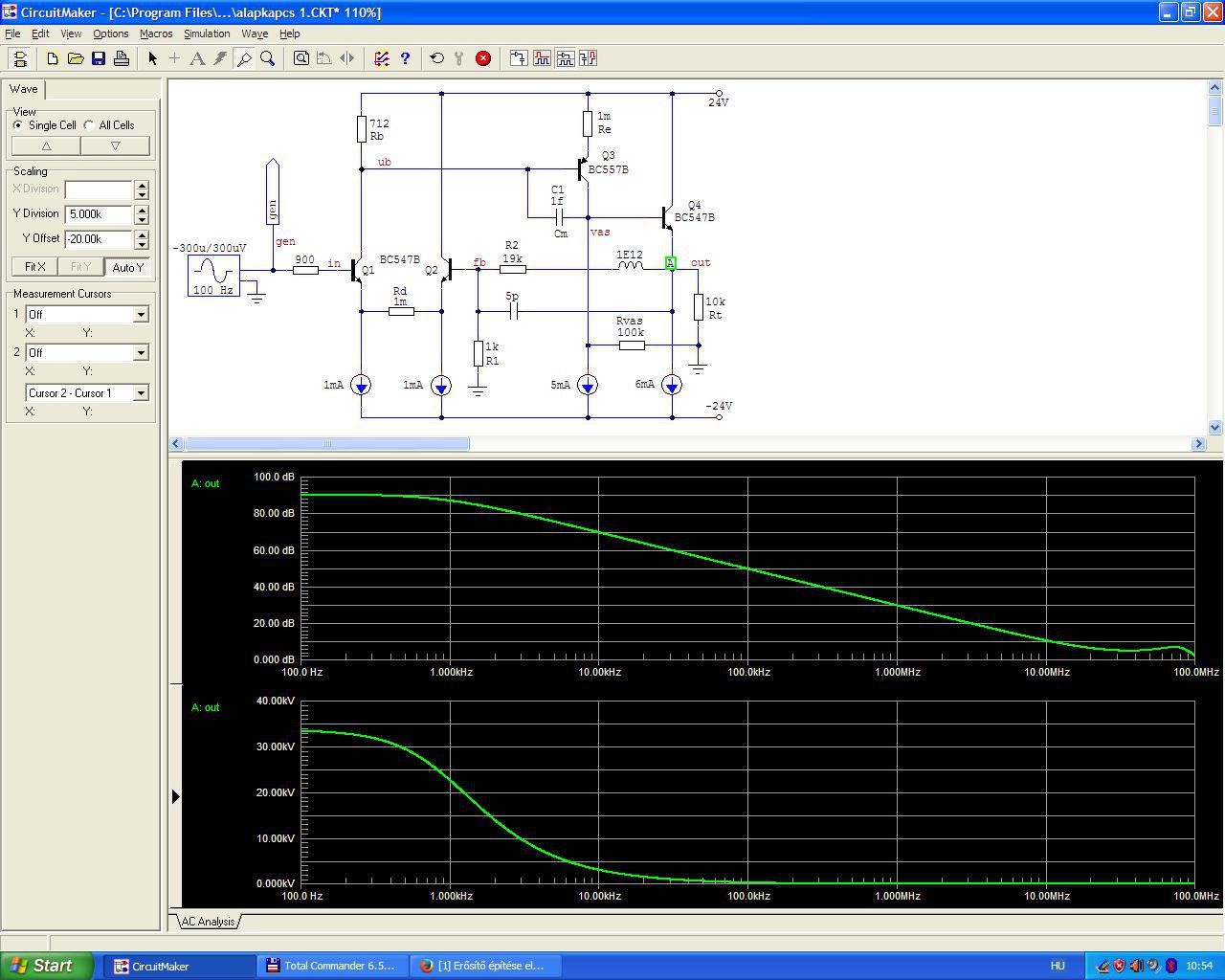 A bemeneti jel 1V, ami 0dB. Ezt adom meg AC analízishez. A CM-ben be lehet ezt állítani - pontosabban át kell állítani ha nem ezt akarom alapértékként használni - nem a tranziens szimulációban megadott feszültséggel (ami generátor feszültség) számol automatikusan, mint az MS. Lehet ebből van félreértés.