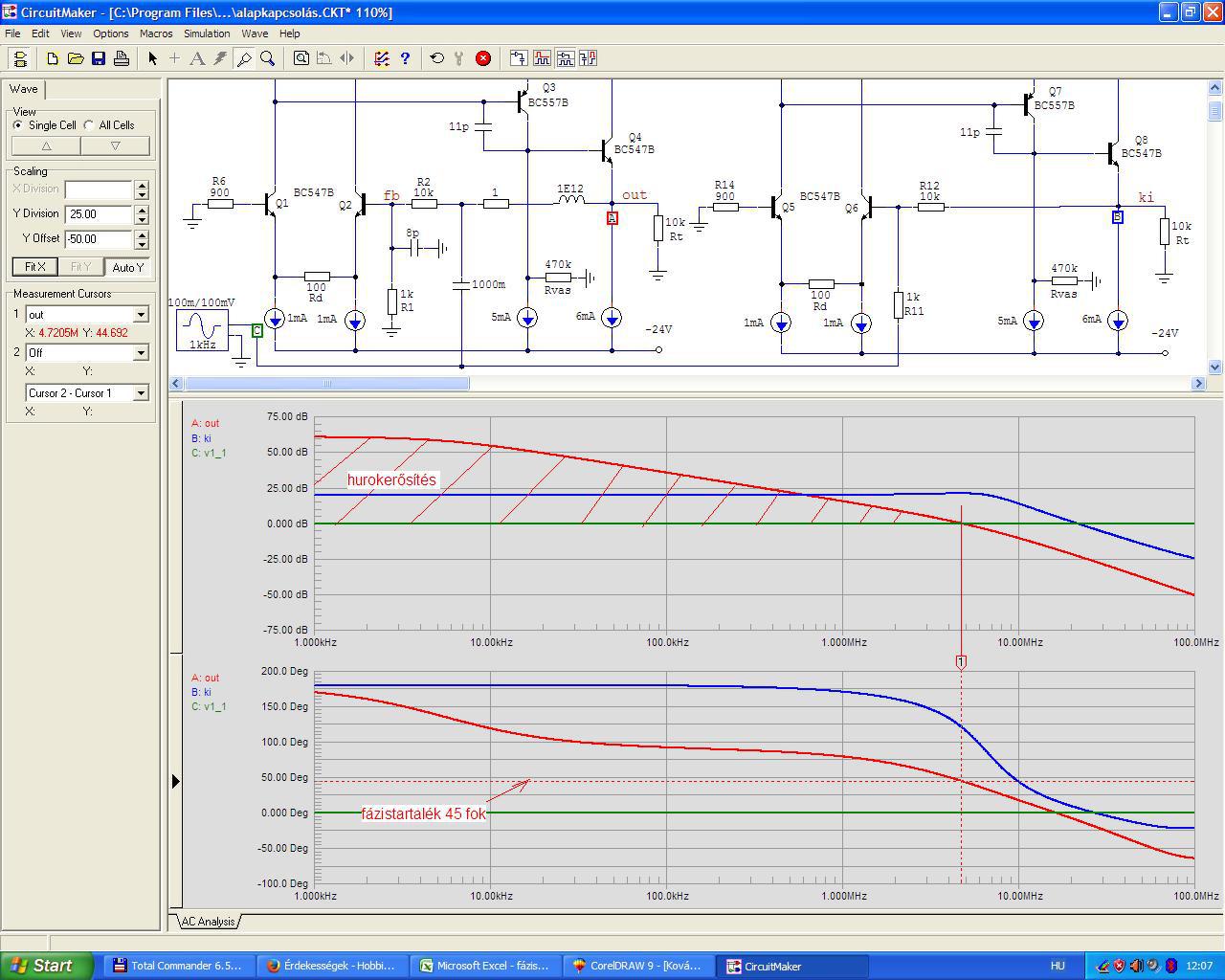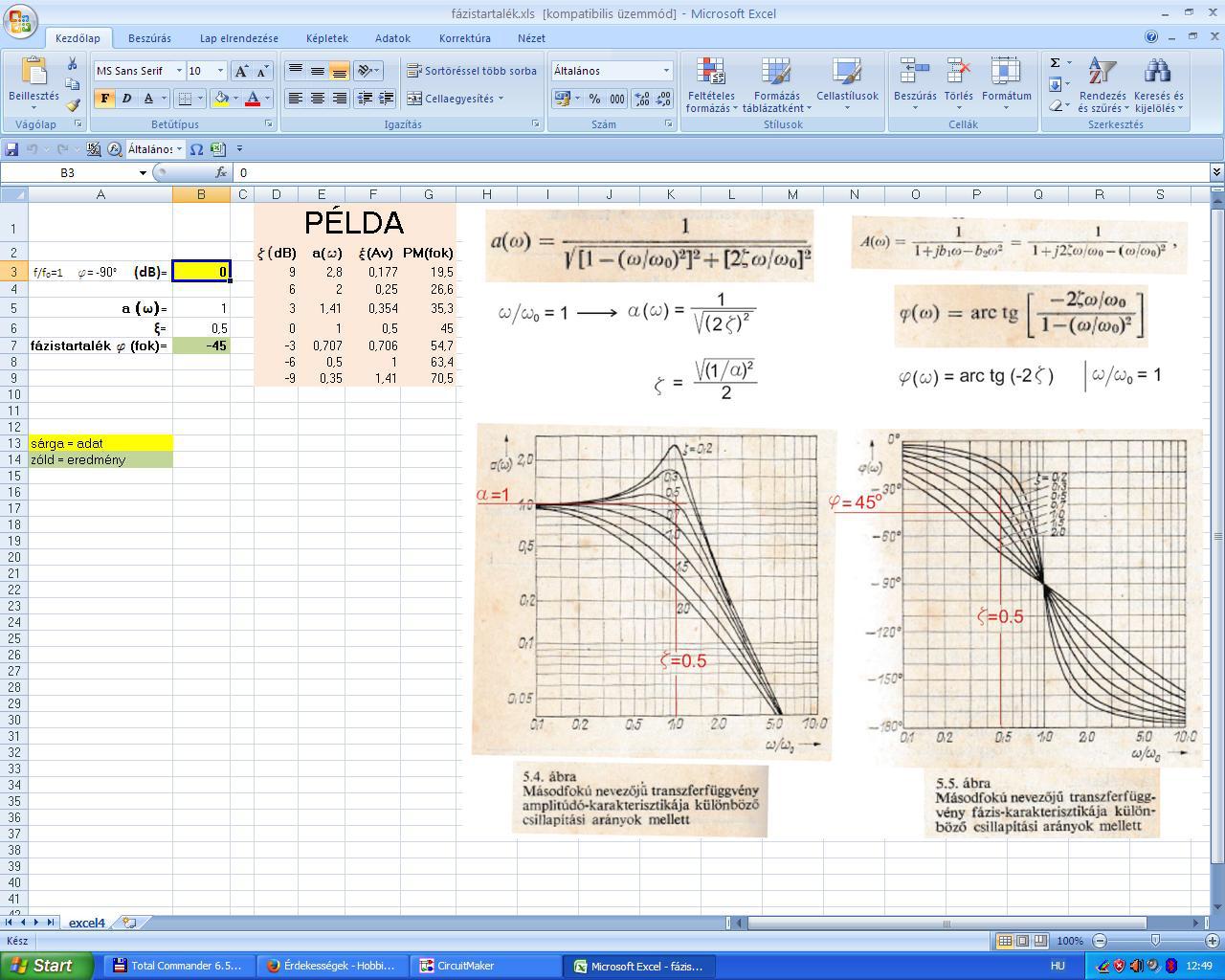 3. "Száz éve" kiszámolták, megszerkesztették, megrajzolták a másodfokú rendszer átviteli karakterisztikáit. Eszébe kellett volna jutnia valakinek, hogy az egyenletek egyszerű átrendezésével pontosan visszaszámolható a csillapítási-tényezőbő, majd ebből a fázistartalék. Lehet megint tévedek, de ezt be kell láttatnia velem valakinek. Nekem egyelőre úgy tűnik, jól működik a dolog a szimulátorban. A gyakorlatban is használható ez a számolgatós Excel-les módszer. Meg kell keresni a szkópon a -90 fokos fázistolás frekvenciáját és az ehhez tartozó amplitúdóváltozást.