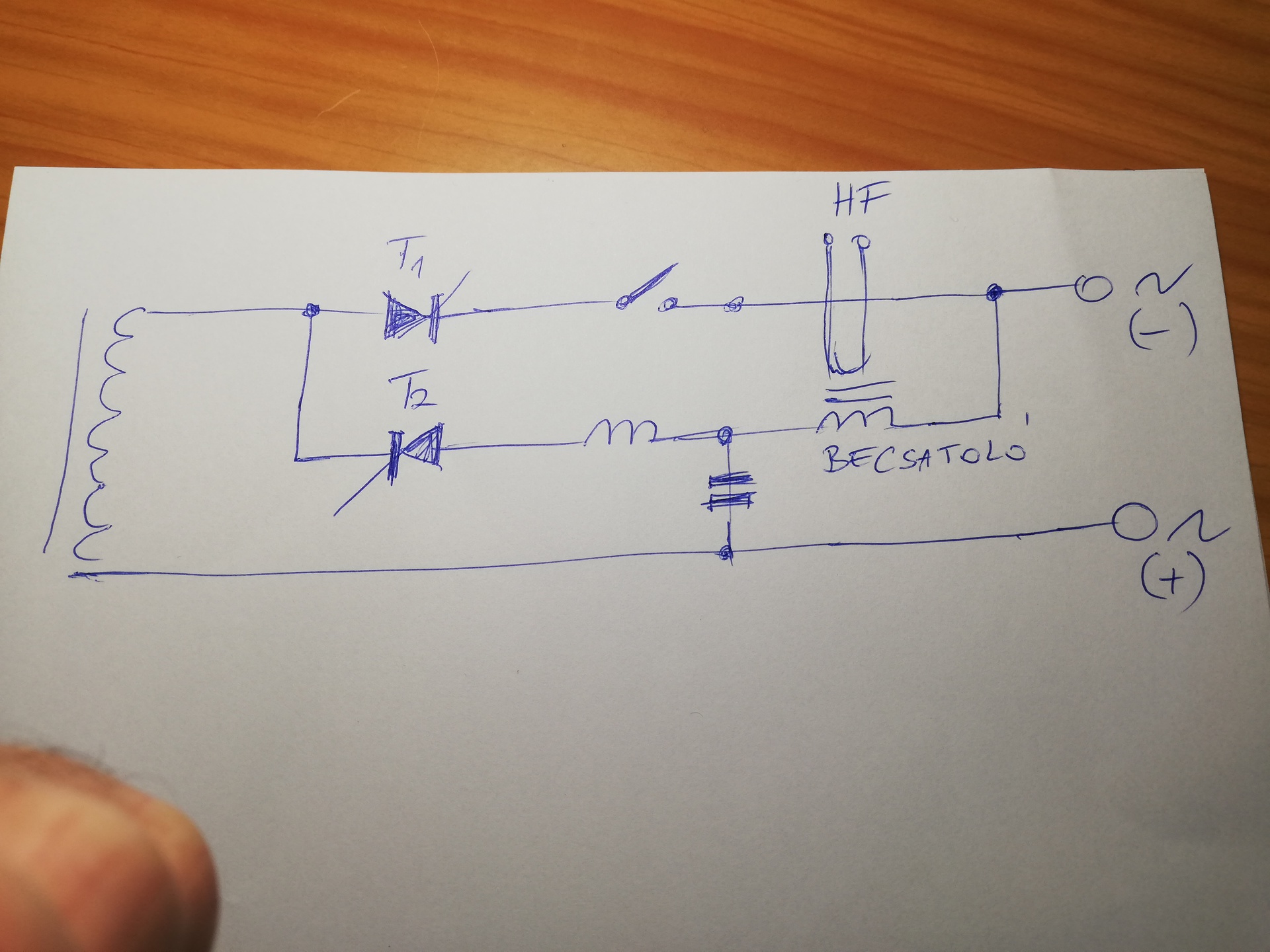 Valahogyan így képzelném el. A fojtótekercsbe lehetne egy reed relé ami adná a jelet a HF gyújtás ill. a T1 tirisztor kapcsolójának az ellenműködtetéséhez.