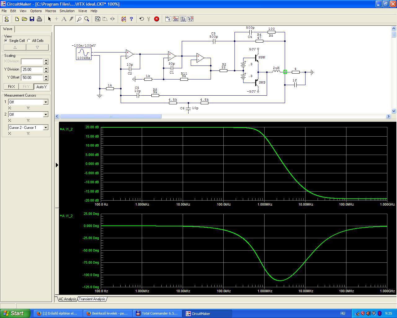 Hát, van itt nekem ez a fetes vacak az asztalomon. Ha ezt ugyanolyan feltételekkel mérem, vagyis ugyanakkora a be és a kimenő jel, vagyis az erősítés is, akkor ez is tudja nekem ugyanazt. Ott van a képen minden, a bemenő jel szintje, a kimeneti amplitúdócsúcs, meg a 0,00009-es THD is... Szóval van világlegjobb erősítőm. És ezt 70mA-es nyugalmi árammal tudja. Ha felmegyek 3-400mA-re akkor még ez a THD is a felére csökken. A valóságban nincs mivel megmérnem, de ha lenne megmérném, enélkül marad a szimulátor eredménye.