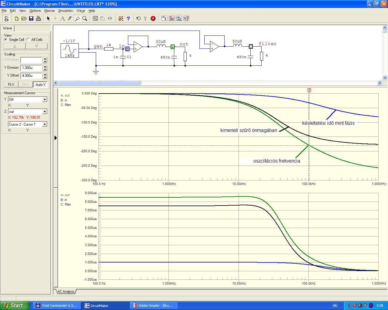 Mint már említettem néhányszor, nem érdekelnek különösebben az analóg erősítők. Ebből kifolyólag nem is olvasok ilyen tárgyú szabadalmakat. Ha néha eszembe jut valami "különleges" akkor kipróbálom szimulátorban, de mélységeiben nem érdekel. Nem túl vonzó, hogy valakik szerint az EAR 2% THD-val olyan jó, hogy kidobálta a félvezetőit ( nem Ge Lee-ről van szó ), aztán itt a benchmark csoda a marha kis THD-val... Szóval ez nekem nem hiányzik. A Purify-ról még el tudom képzelni, hogy miért olyan, amilyen, de szerintem nem a kis THD volt a cél, hanem az a probléma, ami nekem is problémát jelentett. Ez az 5-öd rendű szűrő mindkét problémámat megoldotta. Az, hogy a THD ilyen kicsi lett, csak hab a tortán. Egyébként, Bruno nem egy elvet szabadalmaztatott, mert azt nem lehet. Az elv pl: meleg vízben jobb fürdeni, mint hidegben. Ez egy elv. Szabadalmaztatni az ezt megvalósító berendezést lehet, mondjuk a boylert. Feltéve, ha mondjuk kitalálod, hogy nem gázzal, nem villannyal megy, hanem van benne egy mini atomerőmű. Vagy, azt sem lehet szabadalmaztatni, hogyan lehet a fűből tejet csinálni. ( Oda kell adni a tehénnek... ) De ha kitalálod, hogy a tehén a metán melléktermékei helyett hogyan tud több tejet adni, az már újdonságot fog jelenteni. Ezt Bruno is tudja, nem is a szabályozóhurkot szabadalmaztatta, hanem az áramköri megvalósítását. Vagyis, kapcsolási rajzot. Maga a hurok régen ismert a szabályozástechnikában, legfeljebb nem ilyen célra használták. Van benne erősítő, holtidő, kotyogás, hiszterézis, meg még más is. Ez a Benchmark szöveg erősen reklám ízű, már ott gyanús, hogy 500kHz a sávszélessége ( hogy a keresztezési torzításnál elég gyors legyen... ) és azt írja, hogy emiatt működik olyan jól ez a hibakorrekciós kompenzálás, vagy mi a szösz. Azért vannak ilyen erősítők, amik ezt tudják... de nem hiszem, hogy ettől lesznek olyan jók. De nem is érdekel nagyon. Highand erről biztosan többet tudna mesélni, kérdezd meg ha érdekel. Idézet: „Mint már említettem néhányszor, nem érdekelnek különösebben az analóg erősítők. Ebből kifolyólag nem is olvasok ilyen tárgyú szabadalmakat. Ha néha eszembe jut valami "különleges" akkor kipróbálom szimulátorban, de mélységeiben nem érdekel.” Idézet: „Ez az 5-öd rendű szűrő mindkét problémámat megoldotta.” Szerintem aki UcD-t tervez ötödrendű szűrővel, annak a kisujjában kell lennie az analógnak és akkor is foglalkoznia kell vele ha nem érdekli. Emlékszem, nem sikerült eljutnunk addig a pontig soha, hogy mi is a csoportfutási idő. Leírtam néhányszor, hogy analóg módon is lehet szimulálni a berezgés frekvenciáját, de állítólag keverem a szezont a fazonnal, mert egy RC tagnak fázistolása van és nem késleltetése. Te nem tanultál a csoportfutási időről, tehát ilyen állat nincs is. Ez most onnan jutott eszembe, hogy ebből a "mesekönyvből" mindent letöltök, ha valamit érdekesnek találok azt megtartom (aztán úgysem találom meg soha többé a sok elmentett izé között). Így akadt most a kezembe egy Bruno cikk ismét, ami már lerágott csont, de azért átlapoztam. És valamiért megint eszembe jutottál, meg ez a régi szimuláció is (amit nem találtam meg... hát újra rajzoltam). Akkoriban én sem értettem pontosan és ezzel mindketten így voltunk, de ma már az egyikünk érti. Újra kiteszem neked, hogy a ma se maradj rajz nélkül. Itt a Hipex-nél, még Bruno is másodrendű szűrőt használ a visszacsatolókörben és az alapelveket ecseteli, valamint az analóg és az UcD közötti különbségekről beszél nagy vonalakban. A mai Hipex nem tudom milyen, lehet már nem ez. Most visszaolvastam amit eddig írtam... és nem is tudom miért írtam. Talán az bosszant... jobban annál mint kellene, hogy nem tudok neked megfelelni bármit csinálok. Ha rajzolok az nem jó, ha olvasok az nem jó... van rajtam sapka, nincs rajtam sapka (aki ismeri ezt viccet. érti). Jó lenne ha lenne itt is egy "figyelmen kívül kívül hagyó lista", mint ezeken a külföldi fórumokon. Ott bejelölnélek és soha többé nem látnám mit írsz. Ez működhetne oda-vissza. Persze ezt meg lehetne oldani fejben is. Törekedni fogok rá. Ezt még azért kiteszem, ha már eltöltöttem vele egy teljesen felesleges órát az életemből.