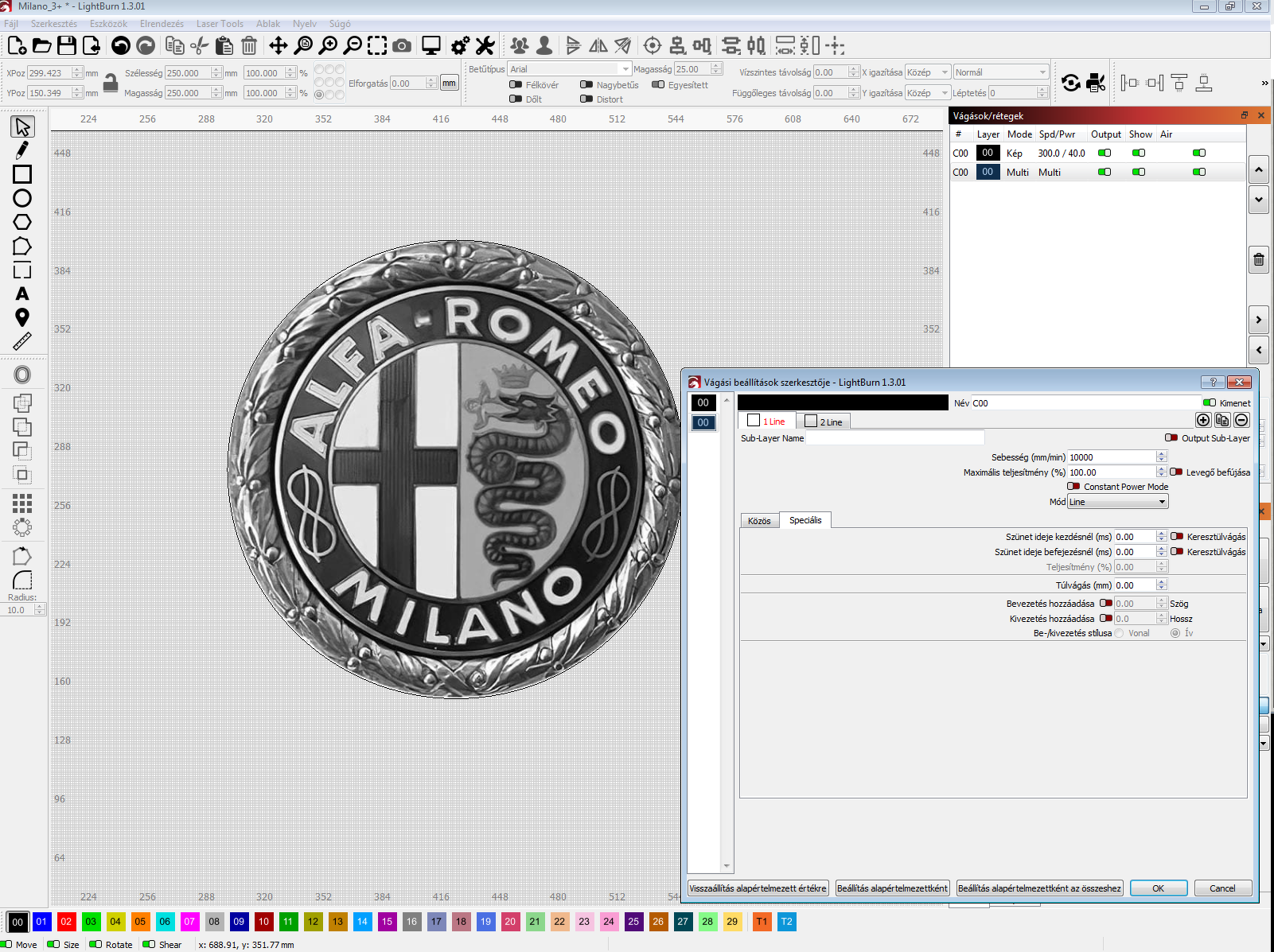 A teljesítményt és a sebességet a layer alatt tudod állítani (2. kép piros nyíl) Azért csak a max-ot lehet állítani, mert a GRBL nem kezeli a min-t. A Szürkeárnyalatos esetén meg tudsz adni min-t is, azt az hiszem, hogy akkor figyelembe is fogja venni a LightBurn. A ditherelés, stb. esetén viszont a beállított max-al fogja a pontokat égetni. Sokan szeretik az Imag-R-t, ami elég okos és ingyenes verziója is van. Ha ezzel csinálod meg a képet, akkor a layeren be kell állítani a Lightburnnak, hogy csak átadás. A hozzászólás módosítva: Márc 24, 2023