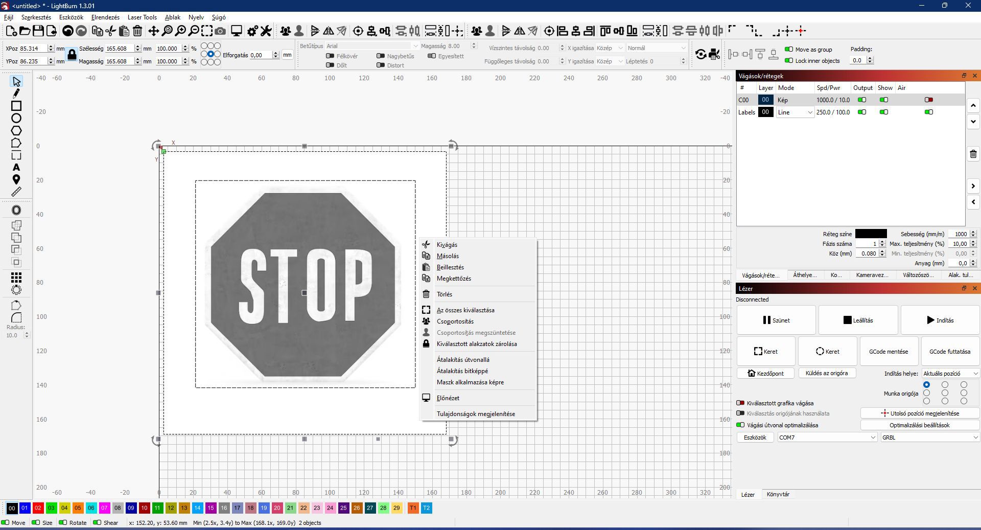 LightBurnban nagyon sok dolgot tudsz állítani. Jobb klikk a képre és adjust image. Ott válaszd ki, hogy milyen móddal szeretnéd gravírozni (ditherelés, skicc, küszöbérték, szürkeárnyalatos, stb.) és állítgathatod a kép tulajdonságait.