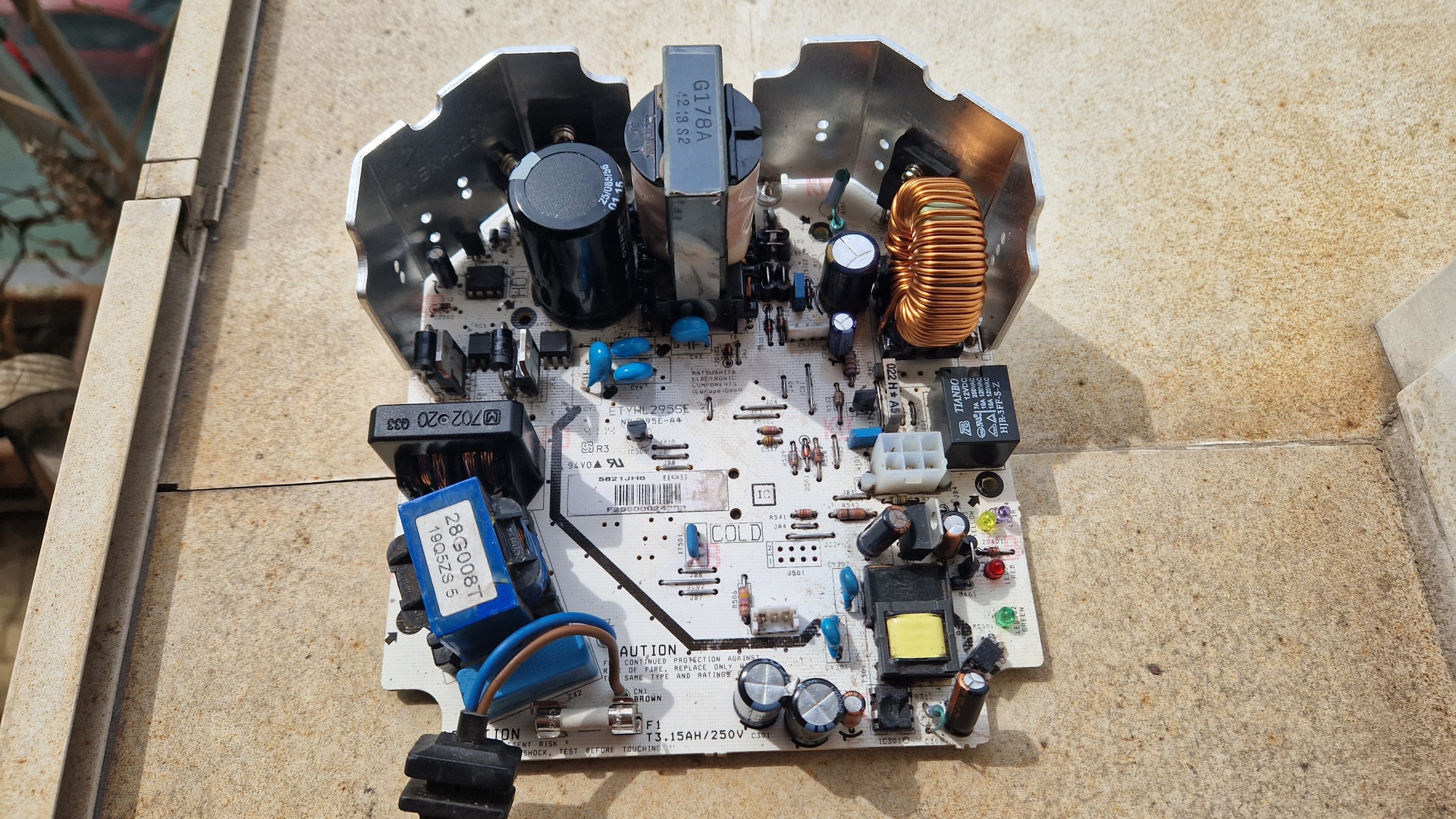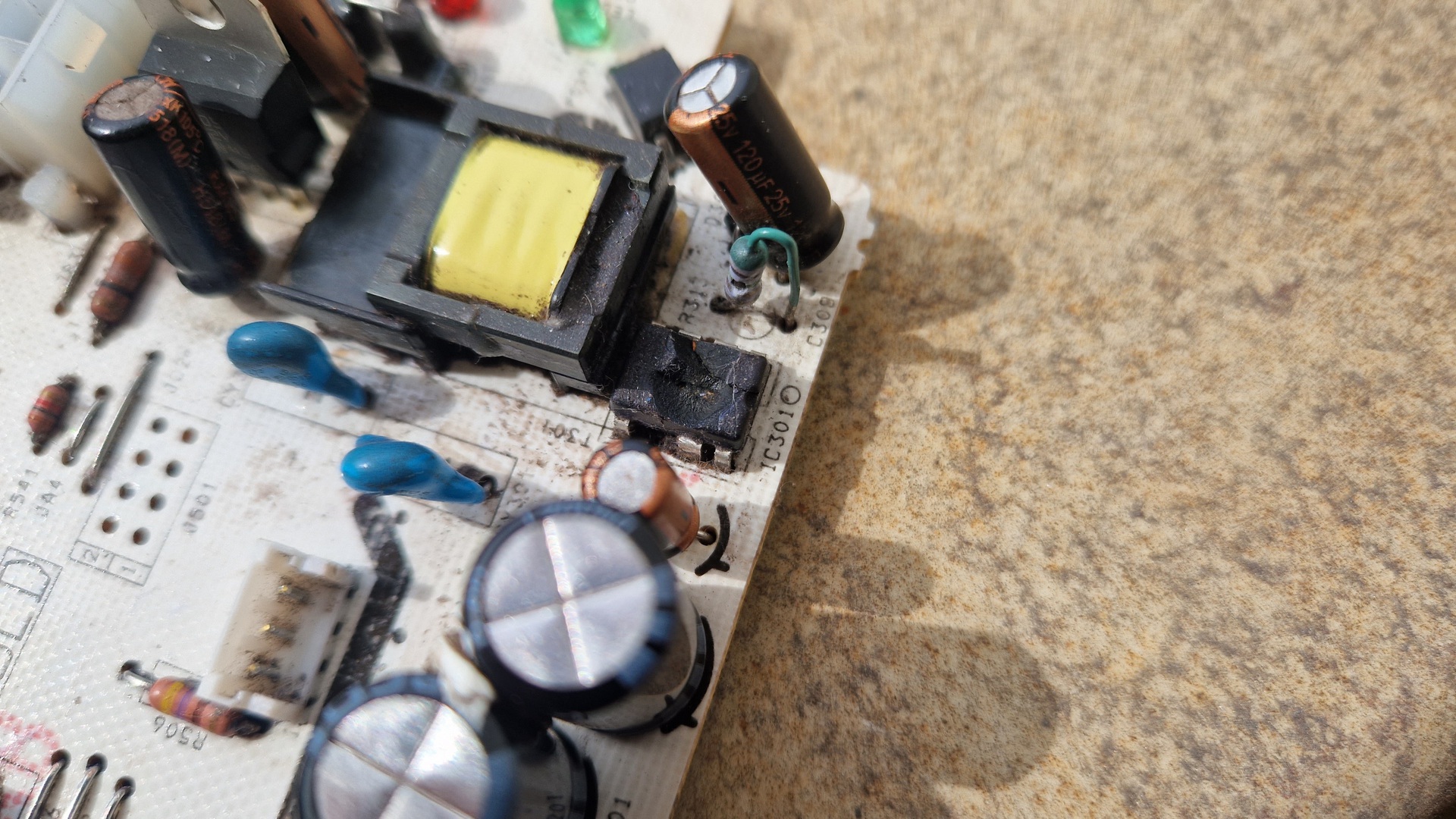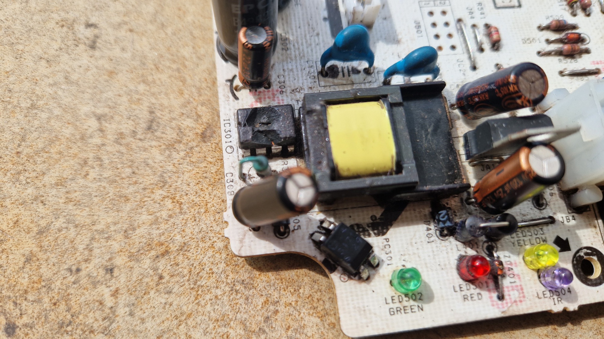 Kaptam egy Hilti C 7/36-ACS akkutöltőt ingyen (nem véletlenül), ez annak az alaplapja. Sajnos semmilyen tisztességes leírást nem találok hozzá. Kicsit megpucoltam, és ami elég nyilvánvaló, hogy rossz rajta, az egy IC, ami "IC301" néven fut. Feltételezem, hogy valami feedback vezérlő, mert egy flyback trafó mellett van közvetlenül az optocsatoló környékén. Nem tudom, hogy eredetileg is csak 7 lába lett volna -e, de csak annyi van beforrasztva (ld. hátlap).
