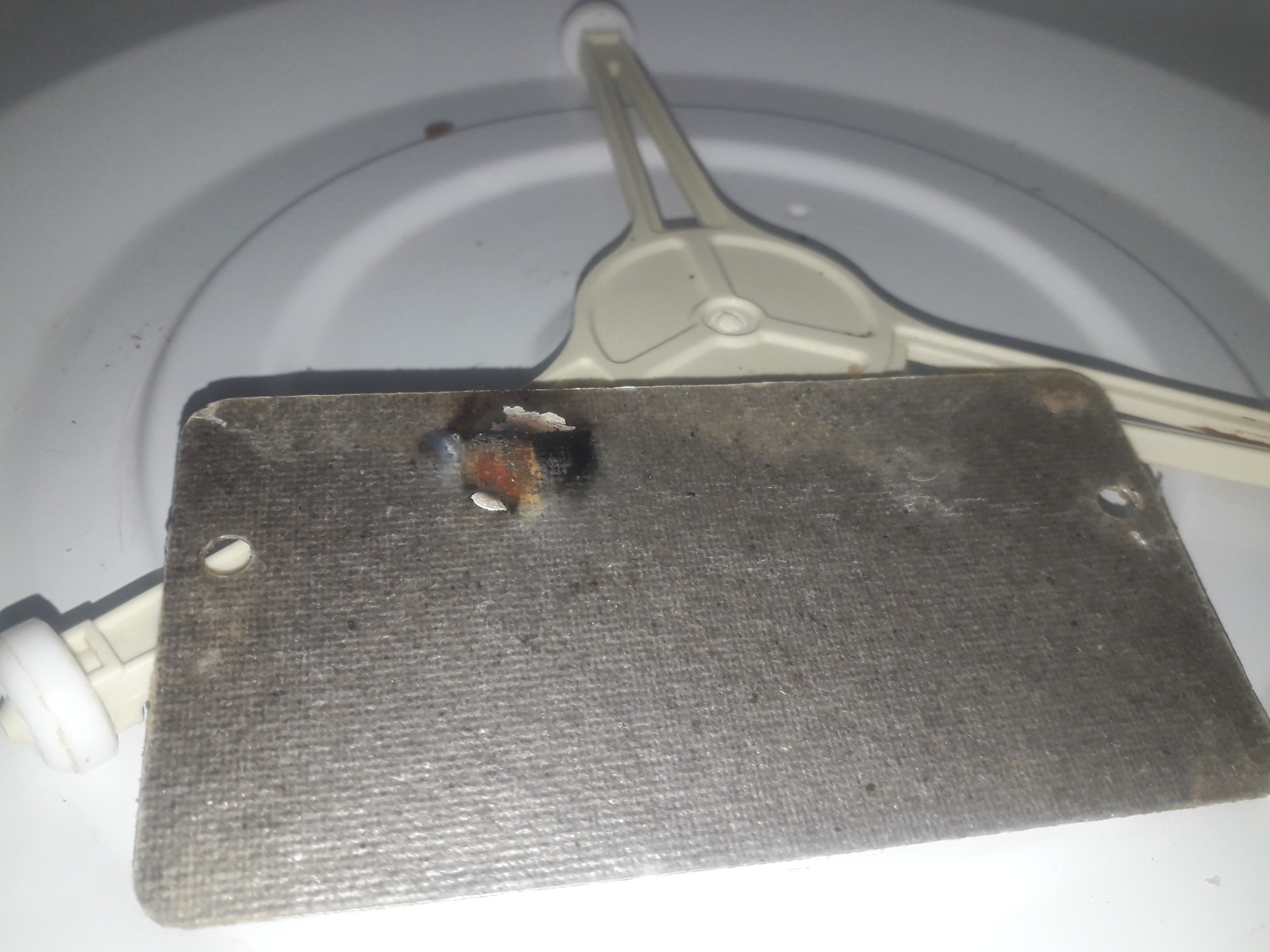 Szia! Magnetron antenna kupakot ellenőrizd, kilyukadt cseréld le. Az égés nyomát finoman csiszold meg, és fújd le festékkel. Csillámot cseréld ki.