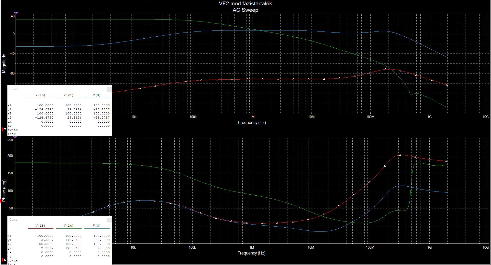 Azt nem értem, hogy lehetne 1-nél kisebb az opamp erősítése? Ez az elrendezésemben mondjuk az opamp bemenetén 500uV a kimenetén meg 1V. Különben, nem értem, hova tűnne a mondjuk 100 dB nyílthurku erősítése az opampnak? Itt egy Bode, terhelés nélkül, meg terheléssel. A felső sugár a kimenet, a középső az opamp kimenete, a legalsó az opamp bemenete.
