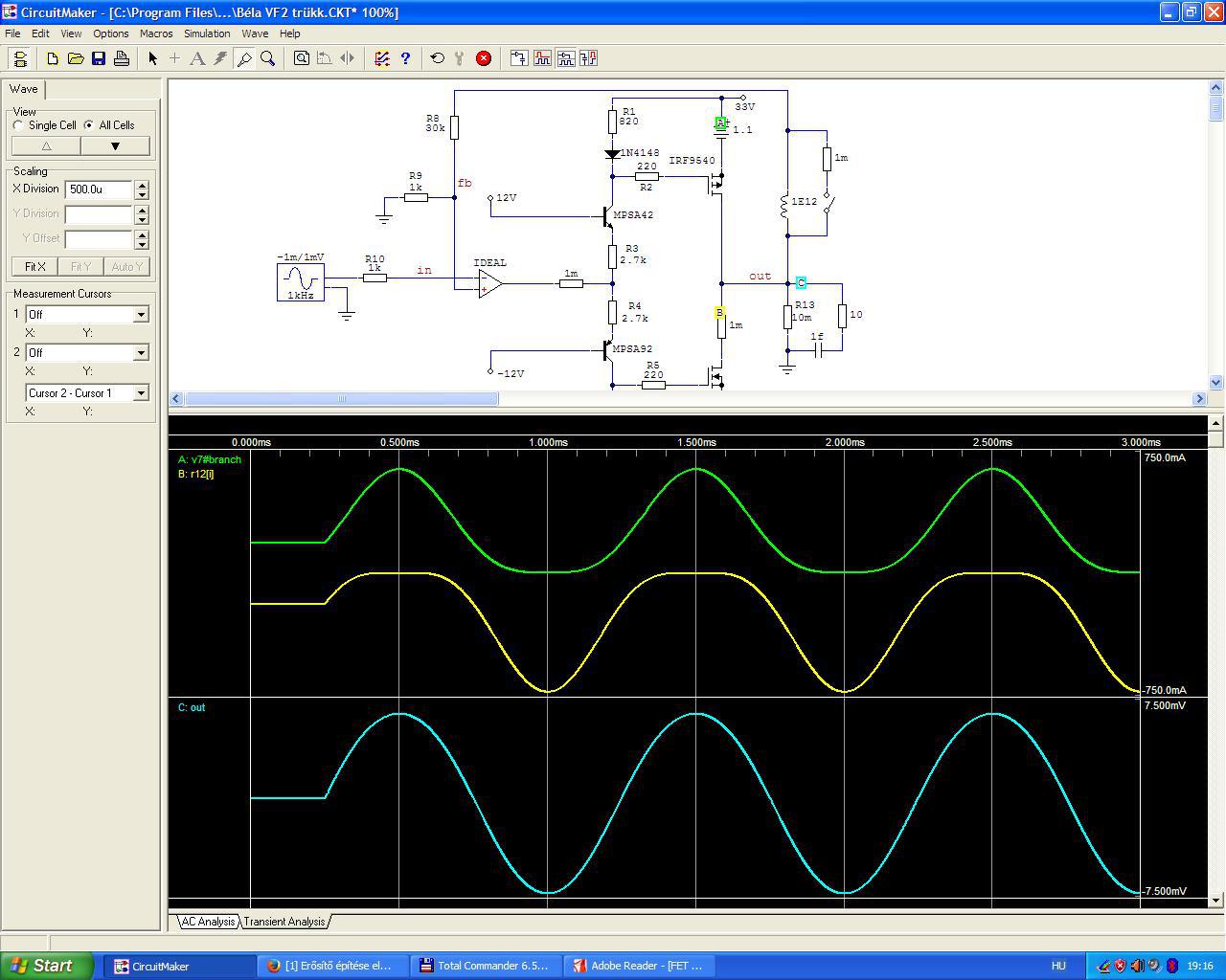 Nem sok időm van,de a fejemben ez volt hajnalban. Képet is teszek, hogy akinek nincs CM, az is lássa. A lényeg, hogy a kimeneti fokozat erősítését fogtam meg egy helyi visszacsatolással, így mind a kimeneti impedancia csökkent, mind a gerjedékenység.