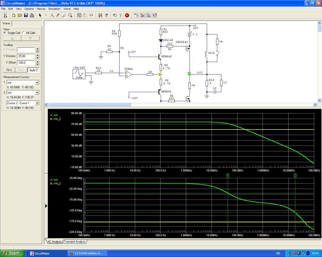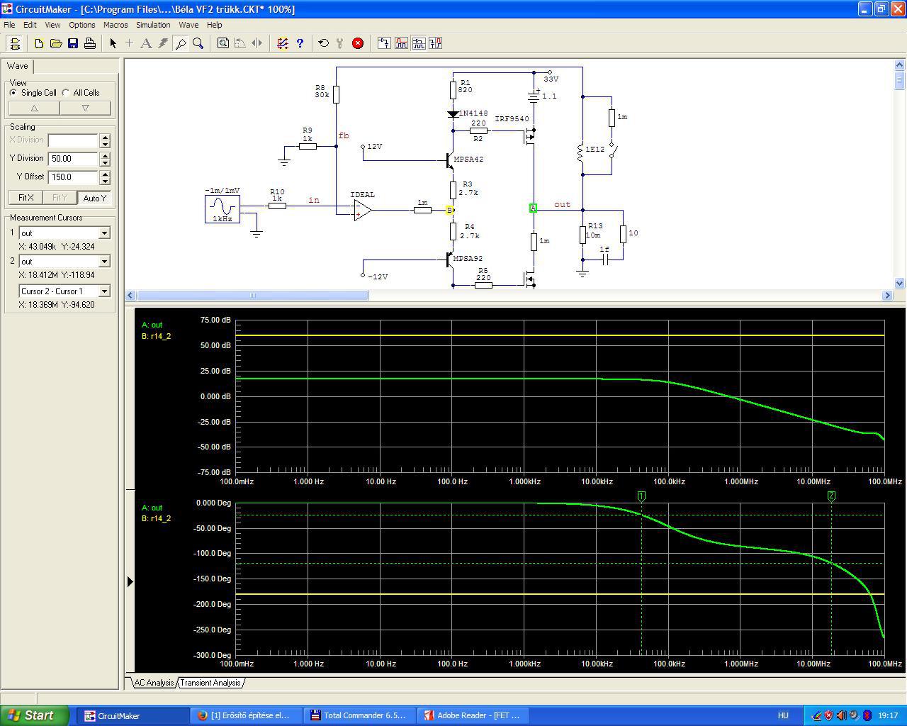 Nem sok időm van,de a fejemben ez volt hajnalban. Képet is teszek, hogy akinek nincs CM, az is lássa. A lényeg, hogy a kimeneti fokozat erősítését fogtam meg egy helyi visszacsatolással, így mind a kimeneti impedancia csökkent, mind a gerjedékenység.