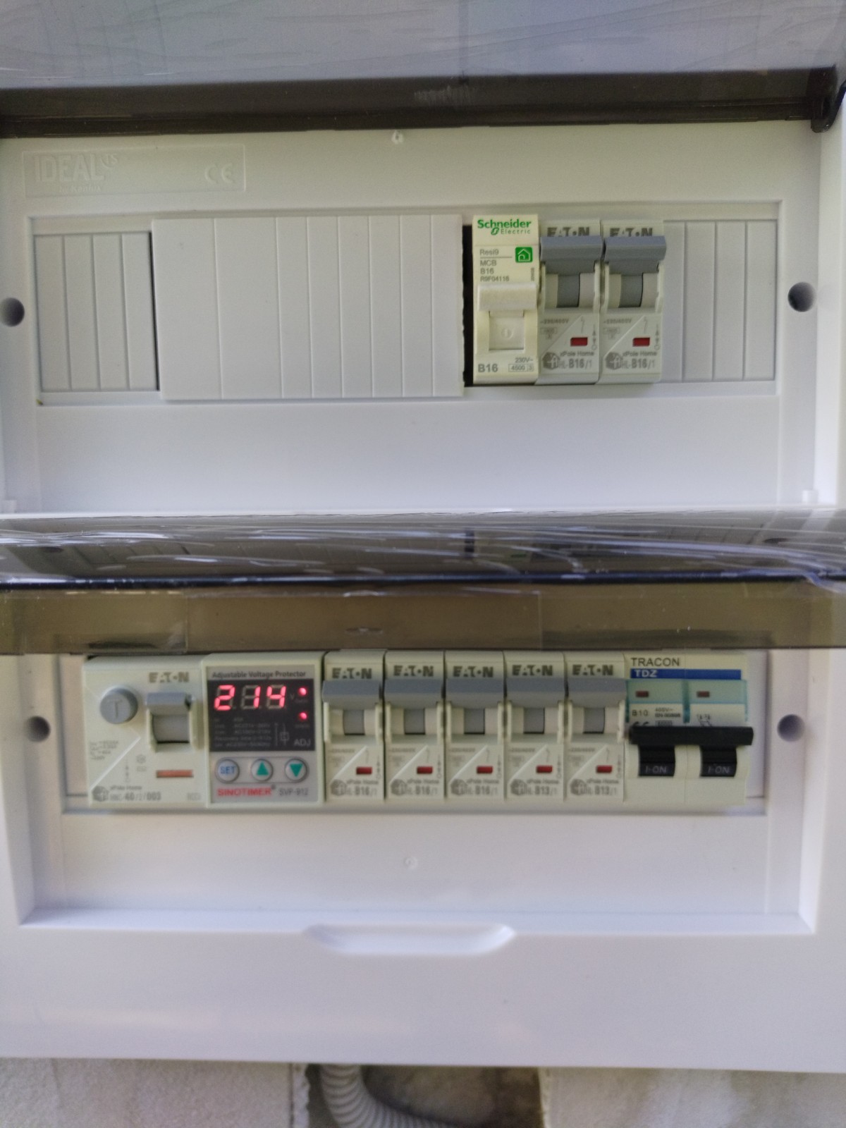 Inkább át kötöttem ,úgy hogy felülről megy a betáplálás. Még a vezetékeket majd el kell rendezni és a kötéseket is módosítani kell ha be lesz kötve az új földkábel, de azt már villanyszerelő fogja csinálni és legalább át nézi hátha valamit elrontottam. A fi-relét teszteltem a teszt gombbal is és egy konnektor teszterrel is és működik!