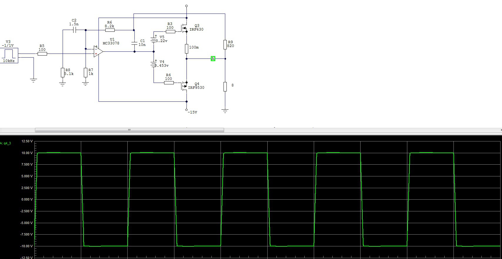 Egy ilyen kapcsolásból kijön 2 x 30V-on 2 x 27V, minimum. Tehát, ne 2, meg 20V-on mutasd, hanem 27V kimenetnél. Nem kell 50 kHz, elég a 20-is. És tedd hozzá a meghajtó opamp kimenetét is, úgy , hogy ne 100nF-dal legyen pluszba megterhelve a kimenet, hanem 1 µF-dal. Egyébként is 2 µF-dal szoktad...
