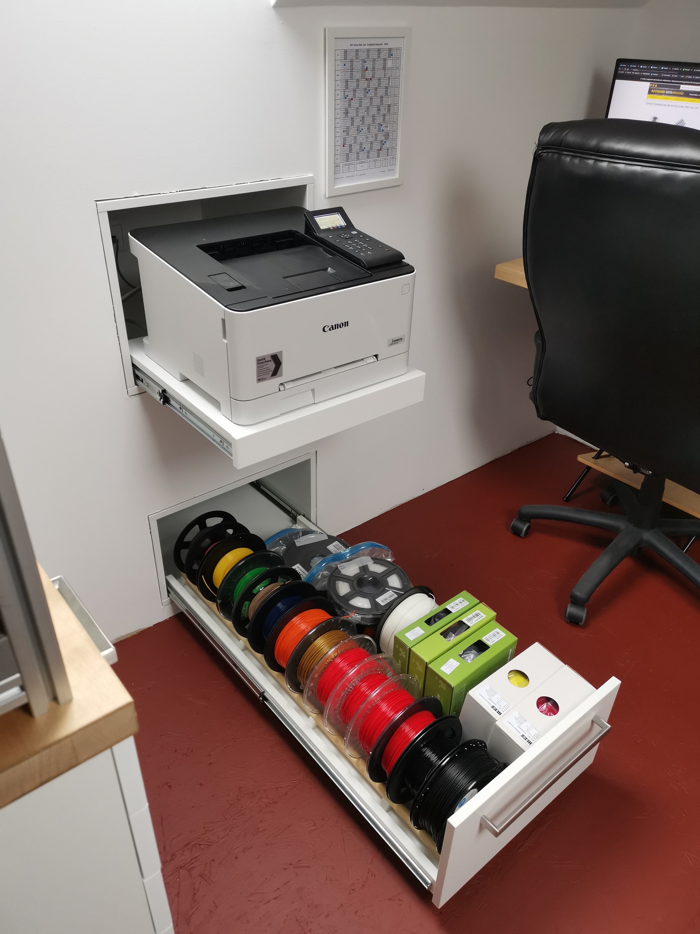 Az előző lakásomban egy kis ablak és szellőzés nélküli 2,3 négyzetméteres gardróbszobám volt, most ez 8,4nm lett és 15,7 légköbméter. Ez gyakorlatilag még sok is. Na meg most már ablakom is van, mindjárt kettő is! A műgyantás nyomtató miatt fényzáró rolók is vannak rajtuk. Régi vágyam volt egy jó hosszú, masszív asztallap ami most végre megvalósult egy 2,5 méteres IKEA-s konyhai munkalap képében. Ez igazi fa olyannyira, hogyha megsérül akkor át lehet simán csiszolni. Ugyan ilyen munkalap van a két fiókos szekrény tetején, ezek a szekrények pedig IKEA-s konyhaszekrények. Tervezhettem volna saját szekrényket de drágább is lett volna meg ez így sokkal egyszerűbb volt. Az új házban annyira megtetszett nekem a fehér konyha amit építettem hogy ugyan azt a magas fényű fehér frontokat használtam itt a kis laboromban. A munkalap és még a fogantyúk is ugyan azok mint lenn a konyhában. A fiókok méreteinek és pozícióinak kitalálása, felosztása külön vagy két hétbe telt... A régi lakásban 225db kis fiókos szortimeneterem volt, itt most kicsit kibővítettem 300db kicsire és 8db nagyra, ez már biztosan elegendő lesz nagyon sokáig, pláne hogy most is még 56db üres. Az egész padlásteret én csináltam, így az elektromos hálózatot is. Biztosra mentem, ezért hét különböző helyre összesen 22db konnektort építettem ki meg három UTP aljzatot. A nyeregtető formája okán oldalt két háromszög alakú rész kiesett ugyebár a hasznos térből, ezeket próbáltam hasznosítani úgy, hogy a lézernyomtatót, a szerverszekrényemet és a filamenteket egy-egy „beépített szekrénybe” süllyesztettem be a gipszkarton mögé. Ahogy a képeken látható, a lézernyomtató és a filament-tartó gyakorlatilag egy-egy fiók. Utóbbi egy 1 méter(!) mély fiók amelyhez külön kellett teljes kihúzású és nagy teherbírású fióksínt vadásznom. A szerverszekrény szükség esetén szintén kihúzható, bár nem sínen. A szekrény három ventilátorral külön szellőzést kapott amire nagy szükség is van mert van benne hőt termelő eszköz meg merevlemezek bőven. Ebben a rackszekrényben van a szerverem, a fő router, három switch, az okosotthont vezérlő miniPC, a kamerákat kezelő NVR, na meg ide fut be az összes UTP a házból így utólag bármit bárhová tudok kötözgetni ha kell. Mivel ez egy padlástér itt igencsak szükséges nyáron a hűtés, télen a fűtés ezért egy 3,5kW-os hűtő-fűtő klíma is beszerelésre került ami pillanatok alatt lehűti ezt a kis teret. Középiskolás korom óta laptopot használok de be kellett látnom hogy már vagy tíz éve egy rendes munkaállomásra lenne szükségem 2-3db monitorral. Csak sajnos eddig egyszerűen nem volt akkora helyem hogy ez elfért volna. Most már viszont van, úgyhogy egy 34 colos 21:9-es monitort választottam ami elképesztő mértékben megkönnyíti és kényelmesebbé teszi a munkát a 15 colos fullHD laptop monitorhoz képest.