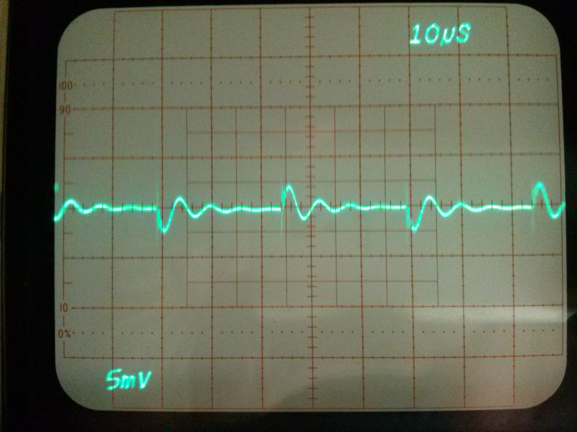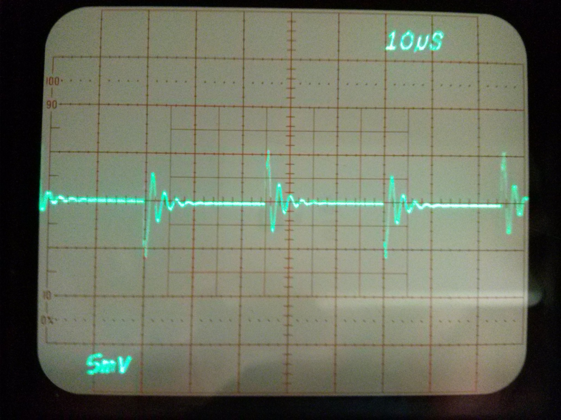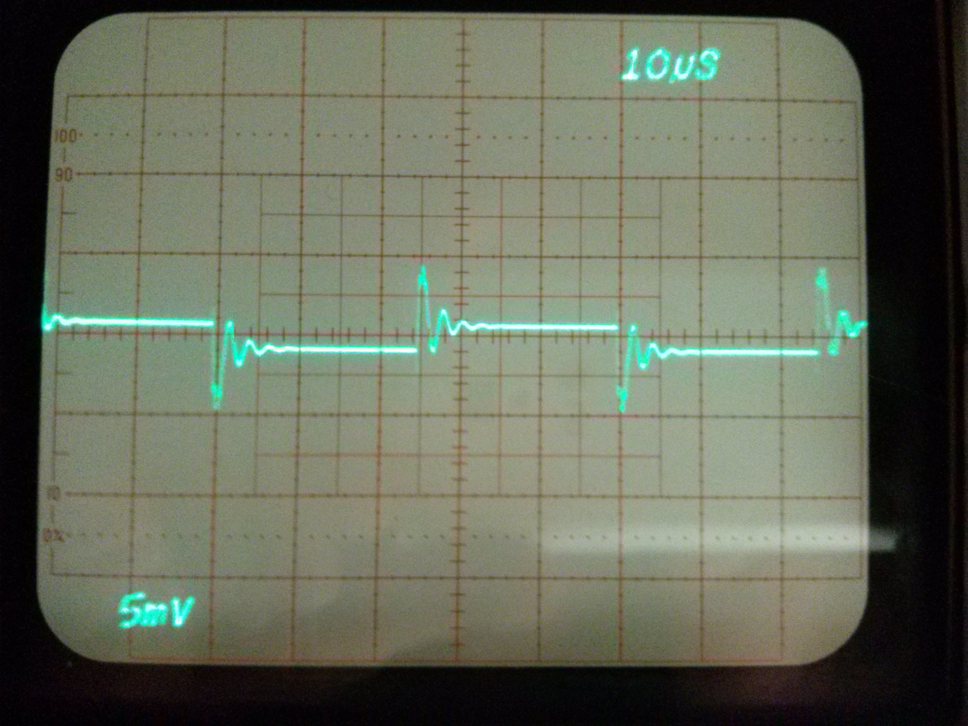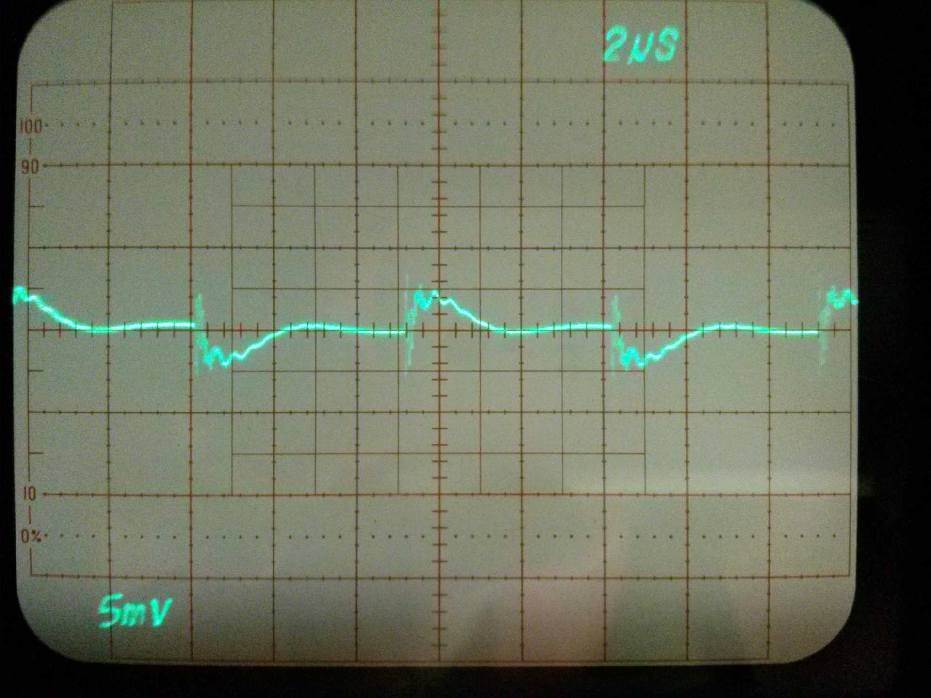 Talán akadnak, akiket érdekelnek ezek a mérések. Az erősítő kimeneti jele 10Vpp négyszög. Zavarjelek a tápvezetéken, osztó nélküli mérőfejjel. A tápvezetékek 35 cm hosszúak és természetesen a hosszukkal arányos energiát tárolnak. Tápszűrő kondi nélkül gerjed minden erősítő. Ha kondi értékét növelem, a lecsengés ideje nő, amplitúdója csökken. A néhány Ohmos soros ellenállás nem sokat javít a helyzeten, inkább csak a táp belső ellenállását növeli. LC szűréssel oszcillál. A legjobb eredményt az elkóval párhuzamos kerámia adta. Nincs ebben semmi meglepő, eddig is tudtuk, hogy így kell... csak ez most látható a szkópon is. A felfutóél nagyfrekvenciás (50 MHz körüli) zavarai a (gagyi) mérőfej saját hibája.