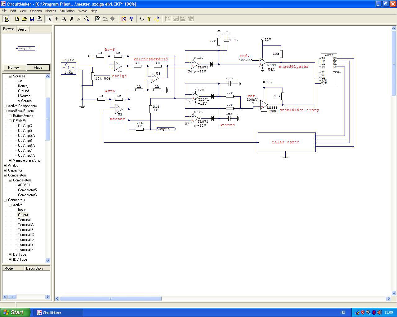 Vedd észre a szimuláció és az elvi rajz közötti különbséget. A szimuláción a szolga 6-szoros erősítésű, a mester 3-szoros és a poti 50%-os állásánál szólnak azonos hangerővel. A szolga és a mester erősítése a gyakorlatban természetesen azonos és természetesen bármekkora lehet. Most arra ébredtem, hogy teljesen jó ennek az elméletnek az a része, hogy differenciális különbség képző. Ha a mester/szolga azonos sávszélességű és hangerejű, a különbségképző kimenetén nincs jel, illetve csak nagyon kicsi (mondjuk 1-2 mV). Ahogy írod, ez szintfüggő is lesz. Mondjuk -50 dB tájékán már nem fog érzékelni, de ezt fel lehet erősíteni egy diódás vágós limiterrel. A limiter a nagyjelszintek miatt kellhet bele. Ez részletkérdés. A különbségképző, a végén U6A komparátorral fogja megmondani mikor szól a mester és mikor a szolga. Hülye nevek, ha tudsz jobbat legyen az... nekem hirtelen ez jutott eszembe. Valamint azt is, hogy mikor kapcsoljanak át az osztó reléi. Az alsó rész - a számlálási irányváltó - teljesen mindegy mit idétlenekedik, ez nincs hatással semmire. Sőt, ha átkapcsol szolgára (mert változott a szint), még akkor is működhet véletlenszerűen bármelyik irányba (mondjuk zavarjelek miatt), a különbségképző fogja majd valamikor megmondani neki, hogy most jó, ne mozogj... és lekapcsolja. Ez lehet 1-2 másodperc is, nem számít. Szerintem most kell elkezdeni kiszámolni, szimulálni, melyik mit is csináljon pontosan.... de most előerősítőzök (a sajátomat). A hozzászólás módosítva: Máj 29, 2023