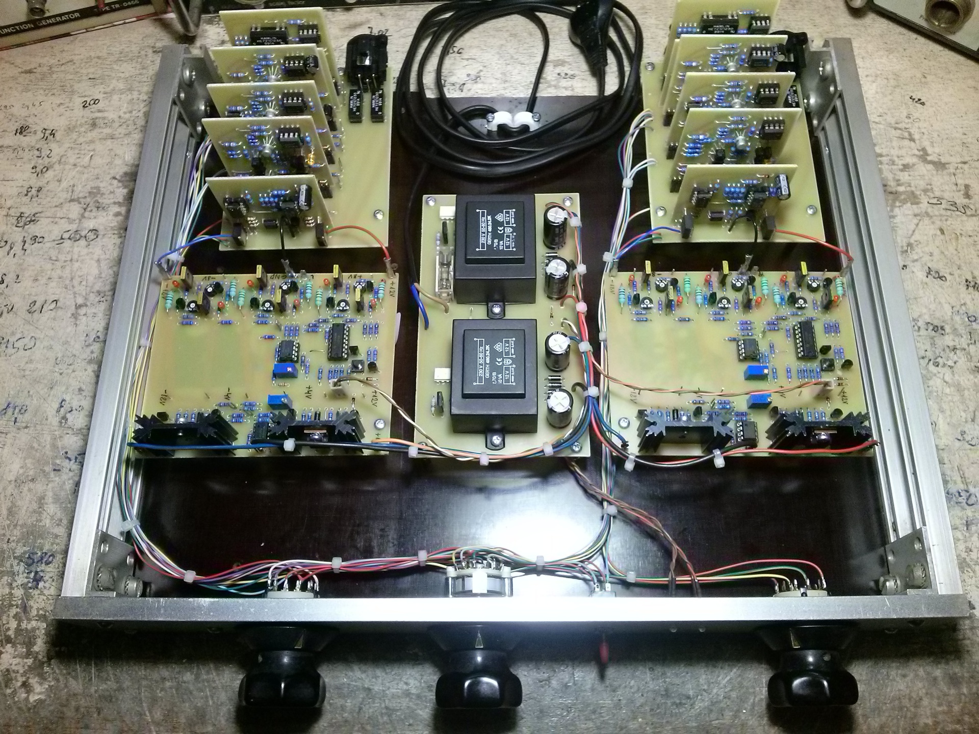 A generátor torzítása még elmenne, de kriminális mértékű 100Hz (és felharmonikusai) van benne. Egyszer összeszedem már magam és csinálok neki rendes tápegységet. Szóval... összedugdostam mindent és volt ám meglepetés/fejvakarás. Akkumulátor ide meg oda, iszonyatos mennyiségű brumm a 2 kHz fölötti sávban (piros színű mentés). Nem azonnal jöttem rá mi okozza. Jelentős részét a "main board" 1 µF-os tápszűrő kondija (ami az első képen látható, hogy már nem látható a nyákon). Jó kis földhurkokat lehet okozni a rossz tápszűréssel (is). Az SSR-ek optocsatolása is visz be brummot, ezt megszűnt amikor a labortáp földjét (amivel a reléket vezéreltem) közösítettem a GND-vel. Még mindig maradt 45uV 50Hz benne. Ezt meg az okozza, hogy a műhelyasztal kerete (és lábai) 20x20-as zártszelvény. Van egy egymenetes tekercsem, aminek a közepén csücsül minden, emiatt aztán mérek néha furcsa dolgokat. Bele kellene flexelnem egy légrést, csak félek, hogy akkor szétnyílna az asztal. Hát ez ilyen. Ha minden osztót bekapcsolok, az 50 Hz 11 uV-ra csökken. A THD-t most már kisebb kimeneti jelszintnél nem tudom megmérni, csak a generátor 3. harmonikusa van ott. Eredetileg erre számítottam, de a fentiek miatt mégis tanulságos és hasznos volt beüzemelni a laptopot. 3 Veff kimeneti jelszintnél már felüti a fejét a 4. harmonikus -115 dB-es jelszinten, ami nagy valószínűséggel az előerősítő torzítása. Ez 2 ppm, azaz 0.0002%. Tényleg nagyon kíváncsi vagyok rá, hogy fog szólni egy ekkora bonyolultságú nem egyszerű szerkezet, úgyhogy következik a másik csatorna.