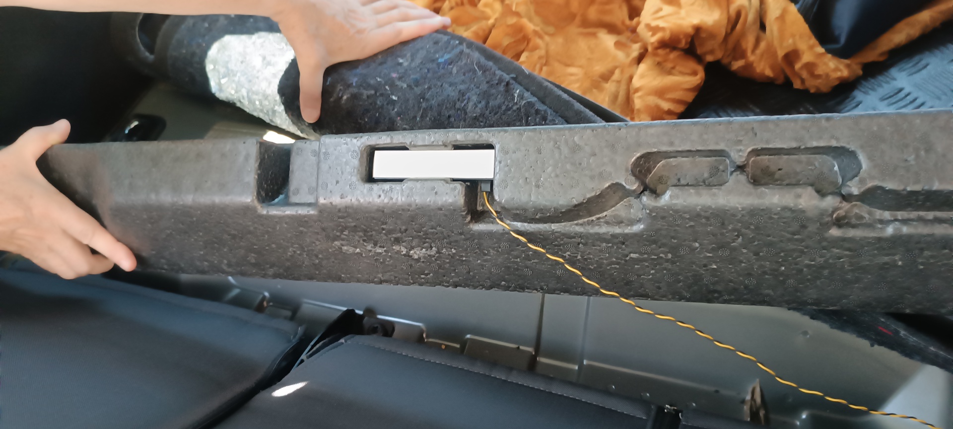 Ford Focus kombi 2010. Az akkumulátor pár óra alatt (de lehet, hogy gyorsabban) teljesen lemerült. Annyi történt előtte, hogy üléshuzatokat húztunk fel. Előtte jó volt. Kitapogattam az üléshuzat rögzítő gumikat az ülés alatt, de nem érztem, hogy valami vezetéket meggyomott volna. Látni ugyebár nem lehet. Hol lehet a probléma? Most ez első ülésről lehúztuk a huzatokat, és amíg húztuk le (10 perc), 12,5V-ról leesett 10,5V-ra a feszültség. A lehúzás után, próba képpen, nyitva hagytam az ajtókat (a belső világítás 2db izzója működött) így 10,25V-ról leesett 10,15V-ra a feszültség. Ez talán még normális lehet. További kérdésem: a képen látható fehér téglatest mi lehet? A hátsó ülést előredöntve, a fekete hungarocell szerű betétet felfordítva látszik ez. Két vékony vezeték megy hozzá. Előre is köszönöm. a segítséget.