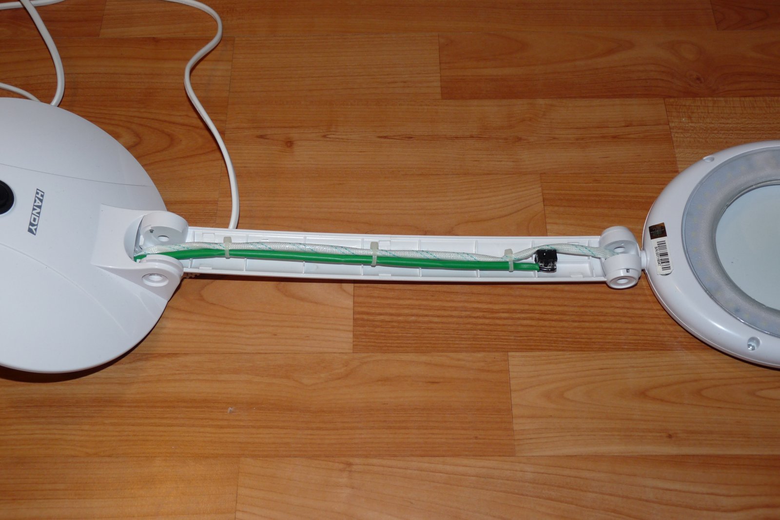 Handy LED-es nagyítós lámpa, amihez a 100mm átmérőjű lencse külön rendelhető, nem tartozék, nem is kell megvenni. A lencse helyére a lencsét rögzítő gyűrűbe pont beleillik a 92mm-es kör ventilátor. Pont belemegy, annyira szorosan, hogy nem is esik ki. A ventilátor egy Cooler Master processzor hűtőről van, de sok hasonlót lehet kapni. Erre került egy 92mm-es porvédő, amit számítástechnikai boltokban lehet venni. Amibe pedig a szokásos szén szűrő szivacs megy. A lámpa talpában pedig egy Hi-Link HLK PM-12 adja a tápot egy biztosíték társaságában egy próbanyákon. Szerencsére egy második táp felfogatása szintén megvolt a talpban, így a rögzítés is oké. A 12V-ot pedig felvezettem a lámpa szárán egy jack aljzatba, így a ventilátor egy mozdulattal eltávolítható, és máris visszakapom az eredeti nagyító funkciót, ha akarom (bár nem akarom).