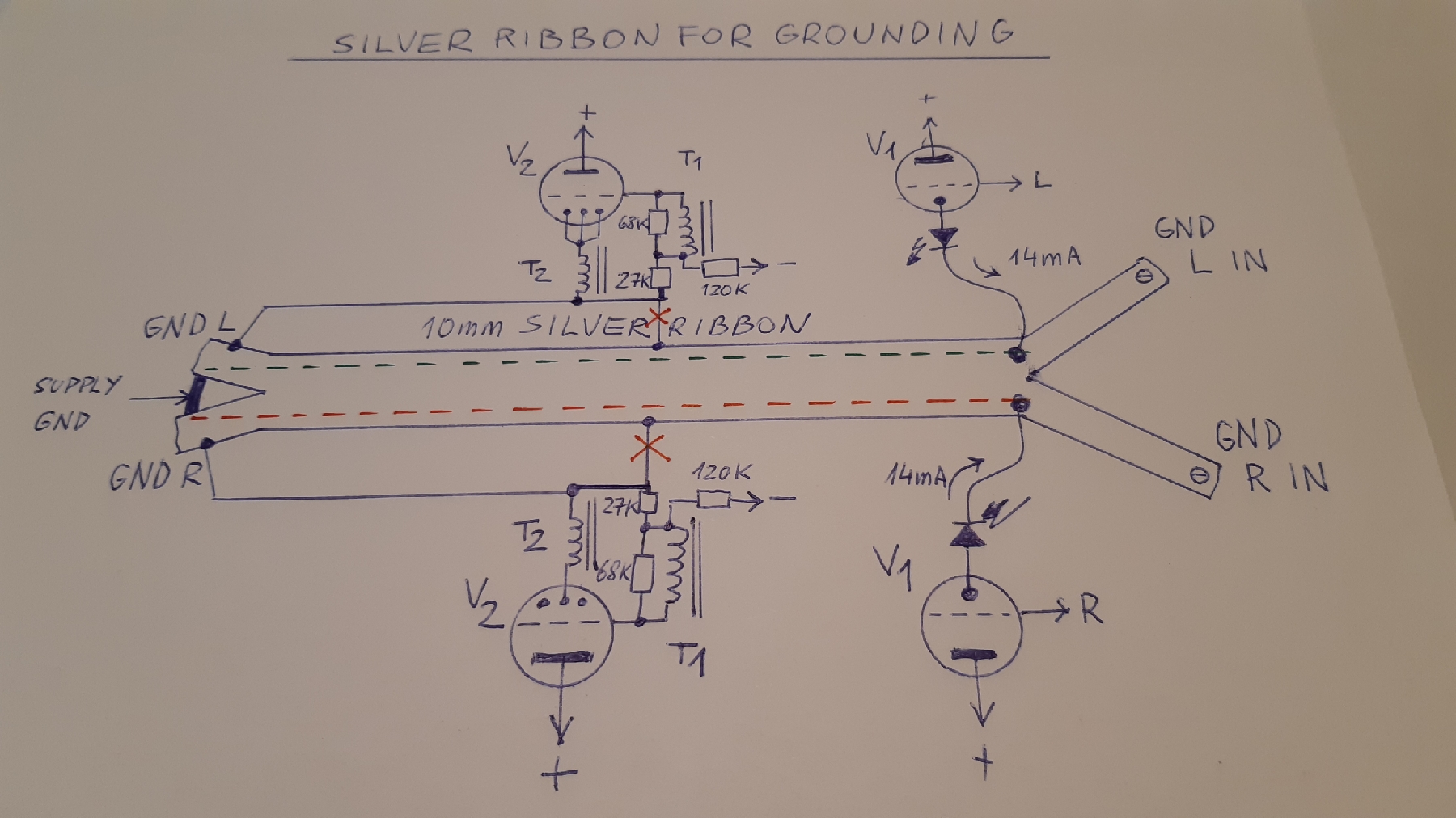 A nagyfeszültségű anódtápegység elektrolitkondenzátorainak - a kikapcsolás utáni - kisütését végző ellenállásnak találtam egy jobb elhelyezést. Mivel ezen az ellenálláson üzem közbeni konstans DC áram folyik, ezt fel tudom használni a testvezetékeken vezetve jobb hangzás elérése érdekében.