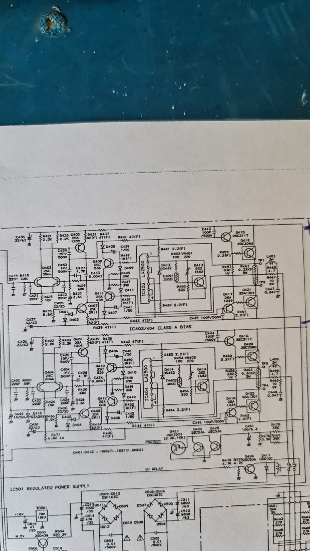 Segítséget szeretnék kérni, adott egy Fischer CA-9030 aminél az egyik végfoknál az a hiba ,hogy a végtranzisztorokon (Q419,421, illetve Q413) a testhez képest minden kivezetésen tápfeszültséget mérek. R435 illetve R436 volt szakadt ( R436 a másik oldali végfokhoz tartozik ,az hibátlanul működik ellenállás csere után). Mi okozhatja a hibát? Csatolom a rajzot mellé.