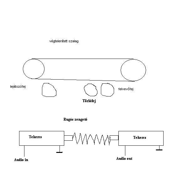 A szalagos is viszonylag egyszerű, ha van egy (legjobb ha külső forgórészes) motorod, ami 1200...1400f/perces, ehhez nyomod egy görgővel az 1/4"-os (nem kazettás)magnószalagot. Ez 39...43cm/s sebességgel végtelenítve jár. Első a sorban a törlőfej, aztán felvevő, majd lejátszófej (ezt szokták egy tolópotiszerű kezelőszervvel mozgathatóvá kiképezni, hogy 2 és 8cm között állítható a táv. arec és play fej között. A nagy szalagsebesség igen jó átvitelt ad, a hossza kb 60cm (körbejár) 20...30órát simán kibírník a jobb szalagok. (volt ilyen Dynacord gyártmányú)