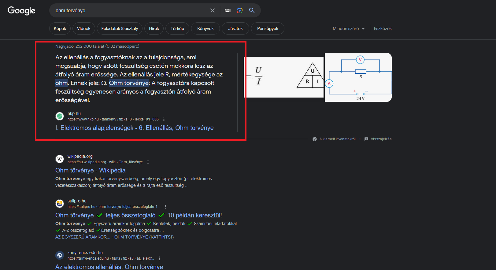 Érdekes, hogy az "Ohm törvény" keresése esetén nincs ilyen kiemelés "Ohm törvénye" esetén van. Ugyanigy "Kirchhoff törvények" -re nincs, "Kirchhoff törvényei" -re van. Szóval még nem tökéletes.
