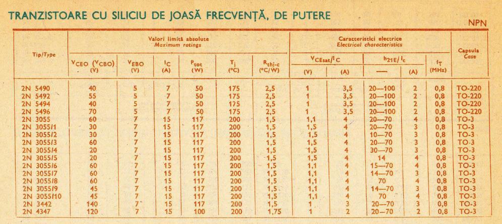 Többször volt téma a "hamisított" félvezető, ami nem tudta a katalógus szerinti adatokat. Most találtam egy román nyelvű mini-katalógust (a kiadási évet nem tudom de említik benne Ceausescu-t) melyben a 2N3055 tíz féle módon szerepel. A megengedhető Uce és h21 értékekben van eltérés. Nem sikerült megtalálnom melyik adat melyik gyártóé, de egyértelmű az, hogy akkoriban se volt mindegy milyen környezetben melyiket használják.