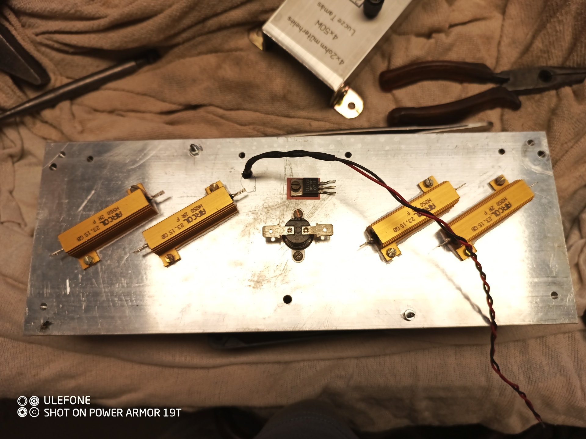 Forraszrással van rögzítve, én is tartottam tőle, ezért teszteltem dc feszültséggel, kétszeres teljesítménnyel, így adódott 70fok az ellenállás nem hűtött oldalán, igaz magát a lábat nem mértem, de csak nem éri el a 200 fokot, illetve ennek a feladata erősítő tesztelés lesz, így ekkora teljesítményt nem kell eldisszipálni. Persze nem több száz W-ra lett tervezve.