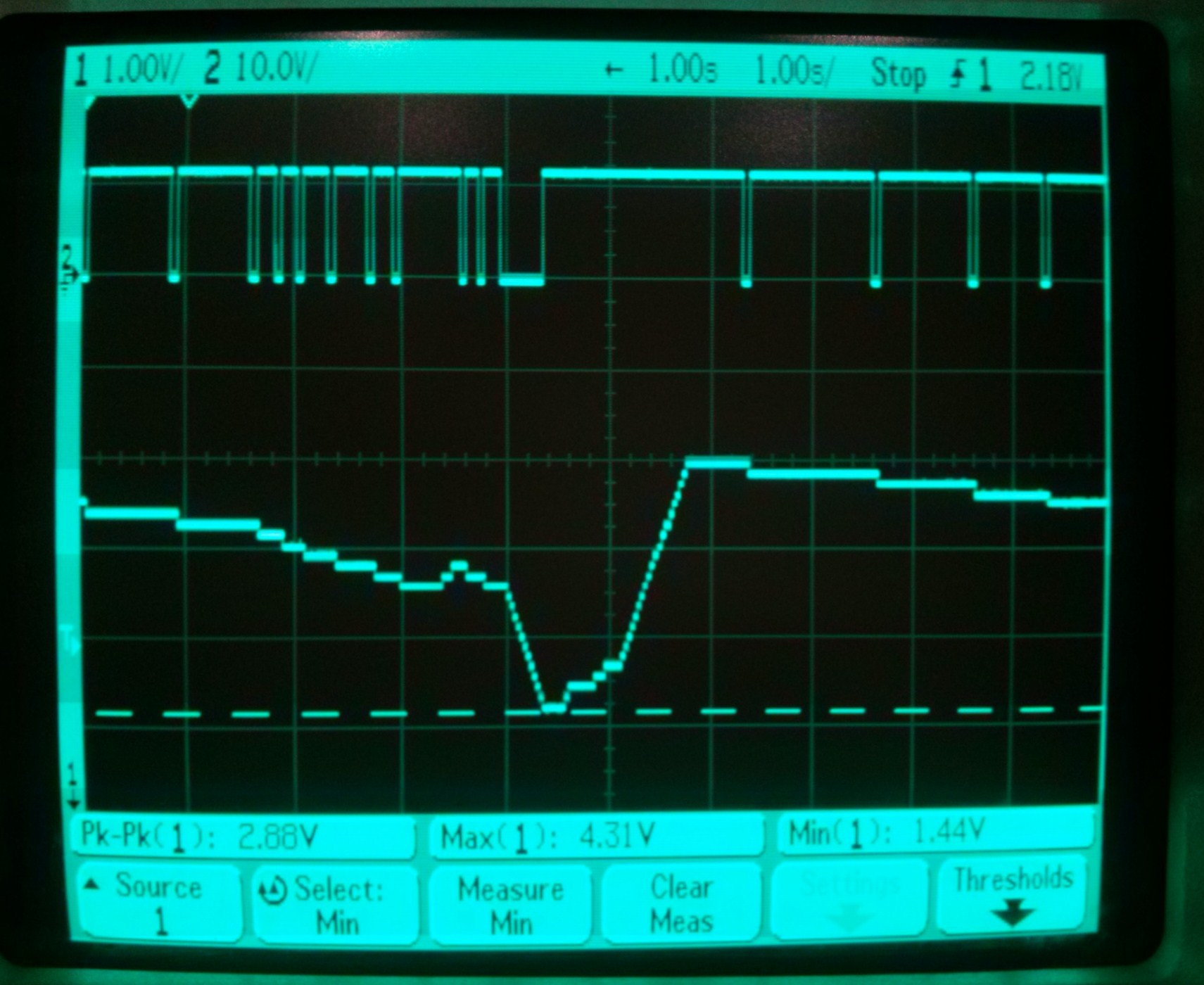 Az alsó sugár az AD kimeneti feszültsége, ami hűen - de kvantáltan - követi a vezérlő feszültséget.