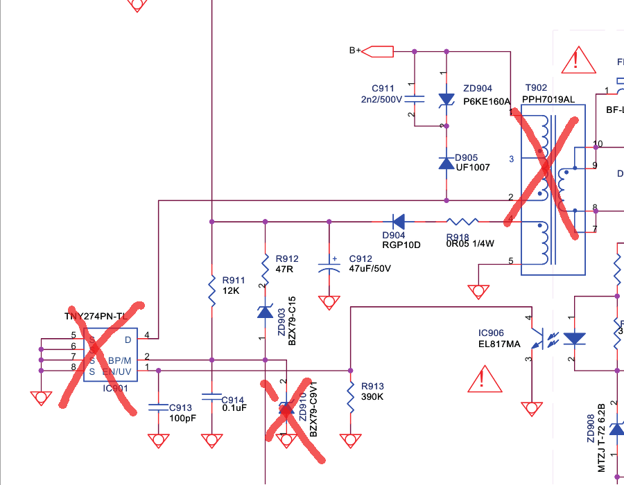 Itthon szétszedtem, láthatóan tönkrement IC-t (IC901) láttam, a ZD910 Zener és a T902 trafó is cserélendő volt (Az 1, képen látható) . Megvettem, kicseréltem, életre kelt a TV, (mutatta is :nincs jel, ami igaz, hiszen ha nincs beledugva se antenna, se semmi, akkor így kell).