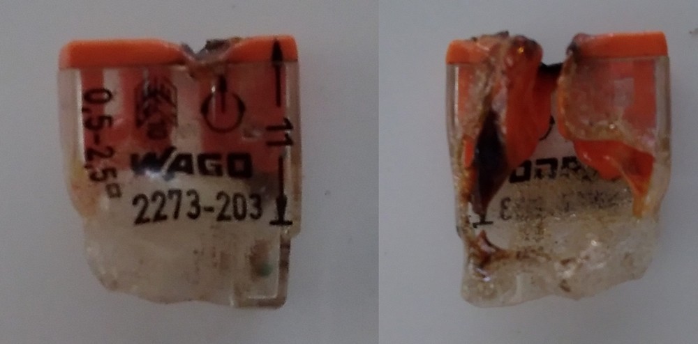 Már ketten vagyunk, ez a "remekmű" is világított pedig zárlat sem volt. Mai délelőtt termése. Szól egyik szomszéd hogy nincs villany a konyhában és a spájzban. A szabványosított "csoda" műanyag része a kötődoboz aljában hevert, a belső rész ugyan még tartott csak már áram nem folyt rajta, szinte szenesre volt égve. Megnyomtam csavarhúzóval ekkor elkezdett világítani és lett áram.