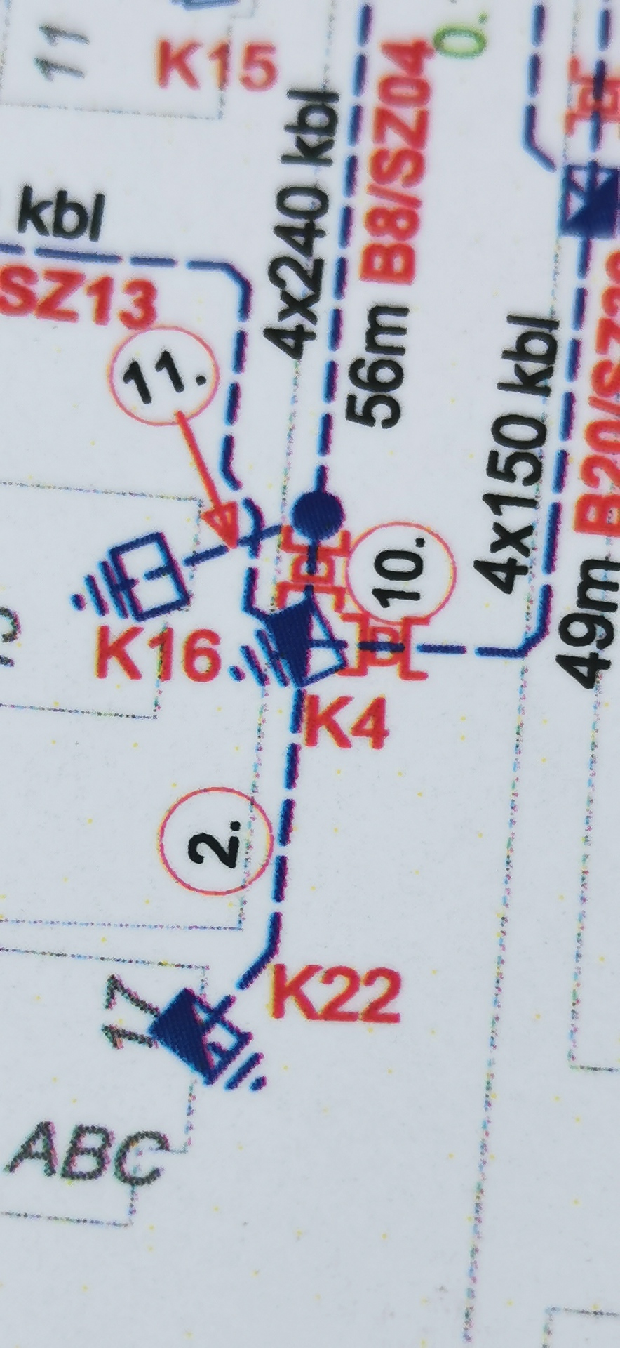 Ami a bal oldali rajzot illeti, az valami saját jelkulcs lehet, mert ha jól tudom, az erősáramot pirossal kéne jelölni. De amúgy egy kisfeszültségű közcélú hálózatot látunk, gondolom, ez tiszta. Van egy szekrény, amit a 240-es kábel táplál meg, és 150-esek mennek tovább a szekrényből. Egyáltalán mi kellene? (a kép felbontása botrányosan elégtelen bármiféle elemzésre)