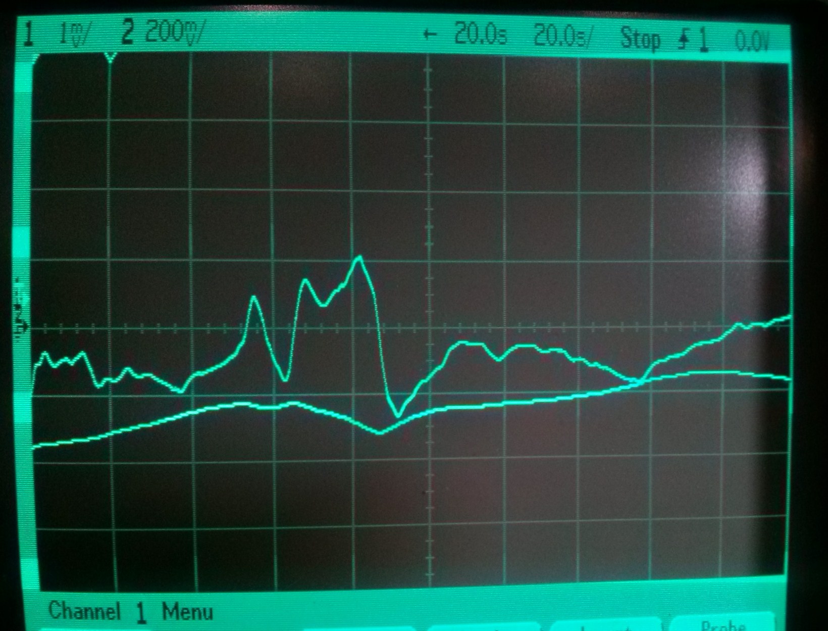 Idézet: „Aztán egy hirtelen ötlettől vezérelve kiszedtem ezt a hibajavítós DC szervót. Na... ekkor lett drasztikus a javulás.” Ez volt az utolsó érdemleges módosítás amiről itt írtam. A sikeren felbuzdulva, úgy gondoltam kiirtom a kapcsolásból a maradék három DC szervót - szépen egyesével - miközben mérek is és hallgatózok is. A második fokozatból kiemelve az opampot, nagyon pici hangzásbéli különbséget tapasztaltam. A kimeneti dc offset alig változott. Nagyobbra különbségre számítottam és magamban szurkoltam is a szervótlan kivitelnek. Változtattam az eredeti elképzelésen és egyszerre szabadultam meg az összes szervótól. Így már 5 mV körüli kilengést mértem a kimeneten, ez még az elmegy kategória és a Burgum amúgy sem DC csatolt, tehát nem okoz gondot. Élénkebb lett a hangkép, de a inkább csak mélyek változtak előnyükre... elment némi döngés. Két napig így hallgattam és egyáltalán nem tetszett a változás. Visszadugdostam a szervókat. Most már ez sem tetszett. Megint műhelybe ki, minden fokozatot belőttem halál pontosan munkapontba. Ez több, mint fél napig tartott... mire minden lehűlt, bemelegedett, beálltak a munkapontok. Behoztam... továbbra sem tetszett, nem változott semmi a hangban. Gondoltam egy merészet. Lejjebb tolom az integrátor töréspontját 0.5 sec-re. Így szabályoz is meg nem is. Szinte végtelen hosszú idő mire három soros szervó kinullázza a kimenetet - ha bekapcsoláskor nem 0V a harmadik fokozat kimenetén is a DC szint (fél óránál is több). Viszont elvileg nem szólnak bele a mély átvitelbe. Újra behoztam... és most jött a "hűha érzés". Ezt kerestem. A mélye is olyan jó, mint szervók nélkül és a közép/magas sáv is tisztult. Ez utóbbi kijelentésemet magam sem tudom hová tenni. Mitől tisztul a középsáv ha benne van a DC szervó? Talán a munkapontok tolódnak el és azt hallani, hogy szervóval meg nem? Minden esetre három napja így hallgatom és nagyon elégedett vagyok vele. Most jön a DE. Sokszor volt már olyan érzésem, hogy ennél aztán már tényleg nem tud jobban szólni valami, ami gépzene. Aztán mindig az jött ki, hogy DE. A "tökéletesnél" is mindig van jobb, ami még mindig nem tökéletes. Nem keresem magamnak a bajt, de megint belekötöttem néhány dologba. A nyák sem jó így, a földelés sem biztos, az egész el van cseszve, tele van bakikkal. Ezzel a két kapcsolással el fogok szórakozni 1-2-3 évet... úgy érzem. Majd megírom mit találtam. Érdekes. Legalábbis számomra. Ott volt a szemem előtt és nem láttam meg... a tegnapelőtti napig. A szervó és kimeneti jel szkóp fotója. A szevó a "nyugodt" jel és a 200 mV/osztás. A nem nyugodt jel a harmadik fokozat kimenetén mérhető. Az időalap 20 sec/osztás.
