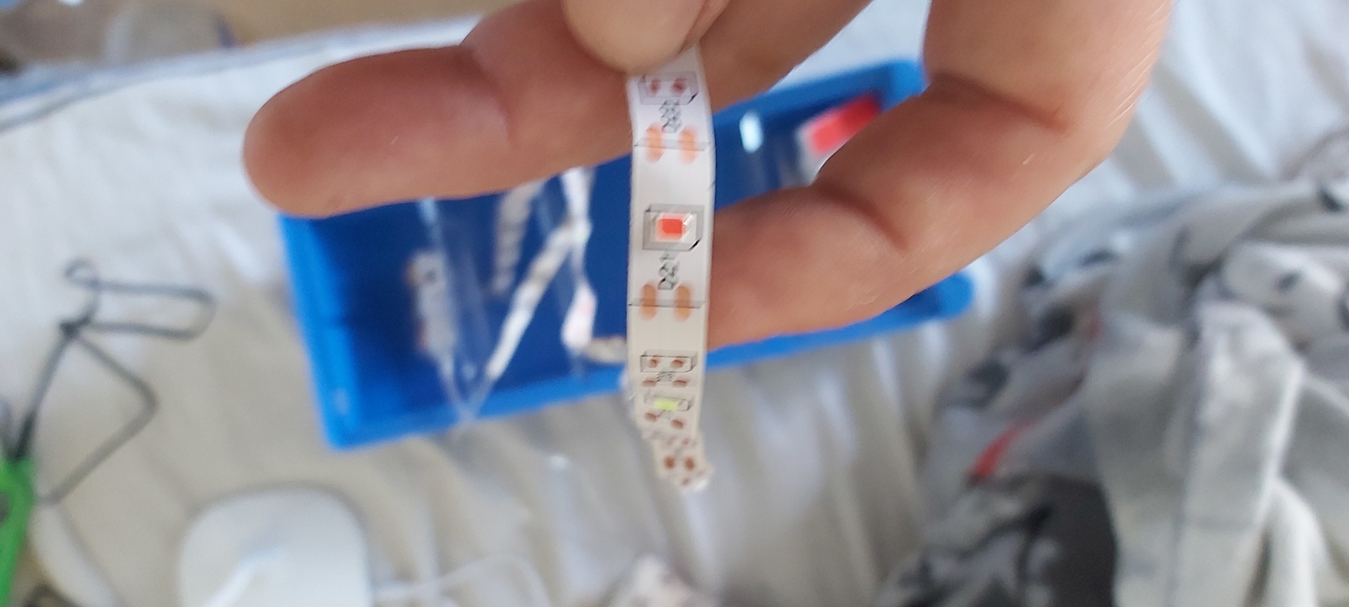 Megjottek a ledek elkezdtem osszeallitani az aramkort. A ledszallagnal nagyon ovatosan kell forrasztani mert hamar megkapja... van valami tipp erre. Vagy csak a,forrasztasmentes csatlkakozo a megoldas. Elenallast az elemek es a nyak koze raktam.