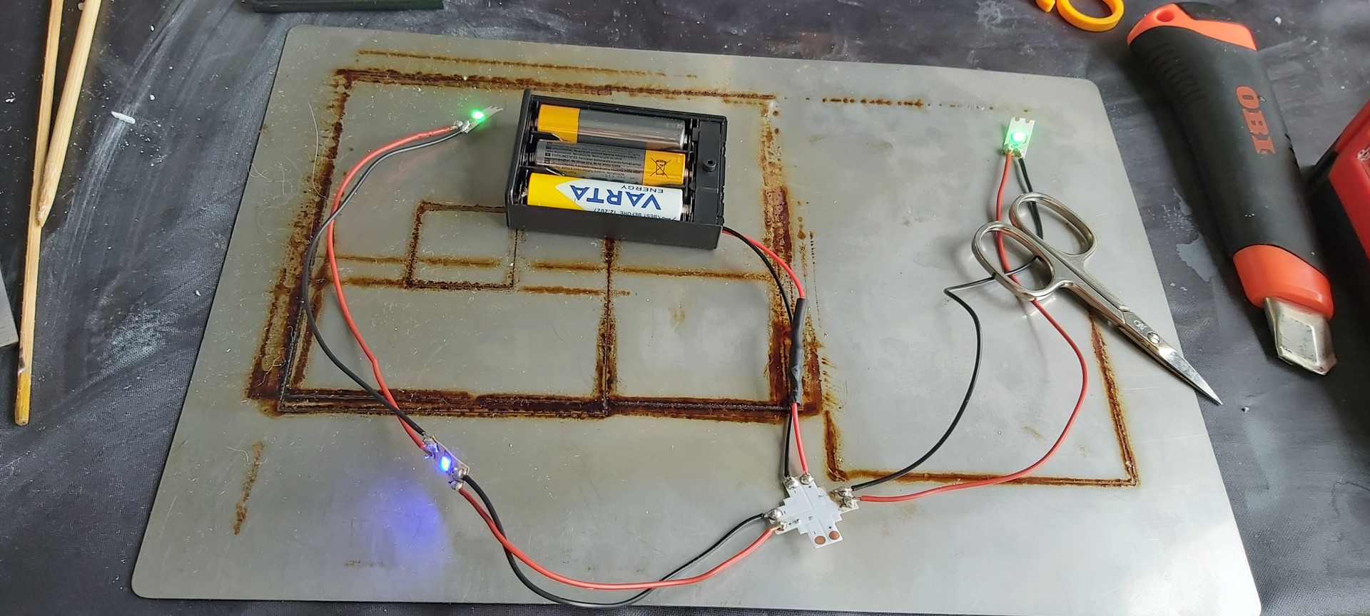 Egy elemtartó, onnan a nyákkal kétfelé viszem a piros fekete vezetéket, egy épülethez elvezetem, ráforrasztom a ledet, majd abból viszem tovább egy másikra vezetékkel, és ott van a vége. A másik oldalon kb ugyanaz. Tehát kb 6 led lenne beszerelve, két felé ágaztatva, egyik oldalon 4, másikon 2. és akkor ha kell, ezek elé, még a nyák és az elemtartó közé forrasztom az ellenállást. 100 ,vagy 150.es talán elég.