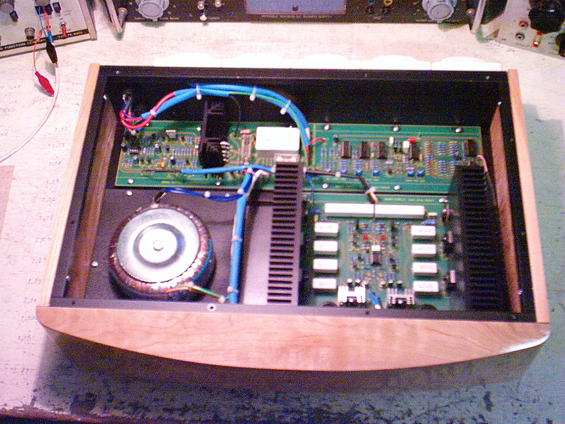 A bemeneten egy közösmódusú LC szűrő fogadta a 230V-ot, nagyfrekvenciás szűrés céljából. Majd 50A-es graetz, és 9400µF (20*470u/450V) puffer. Egy kisebb (10VA-es) trafó a segédáramköröknek adott +/-15V-ot. Ezek közül az első egy 50Hz-es Wien hidas oszcillátor volt, 0.01% torzítással, és szervóval stabilizált kimeneti amplitúdóval. Az oszcillátor kimenete egy AB osztályú végfokot hajtott, amit leginkább PP csöves erősítőkhöz lehetne hasonlítani. A kimeneti 800V-os mosfetek drainjei ellenütemű kimenőtrafóra csatlakoztak, amelynek 230V-os szekunderén jelent meg az alacsony torzítású hálózati feszültség. Külön szekunderről vettem visszacsatoló jelet, a kb. 26dB negatív visszacsatoláshoz. A készülék tökéletesen működött, kb. 600W terhelésig stabil, 0.1% torzítású, pontosan 50Hz-es kimenő feszültséget adott le. Súlyra úgy 20kg lehetett