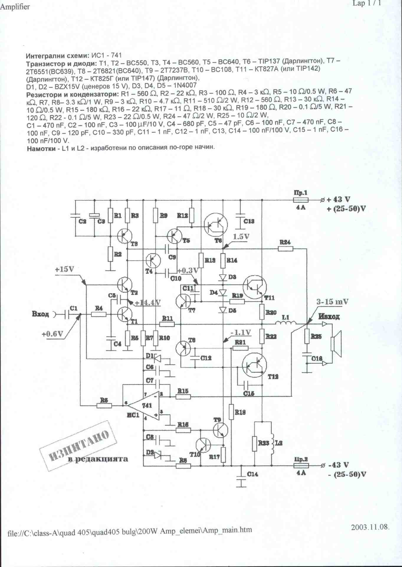 Bő 20 éve ezelőtt ilyesmi kapcsolásban csináltunk 405-ből 300-500w-os erősítőt, 65-95V tápfesz mellett. Persze, egy ilyen Quad minimum 10db végtranyót tartalmazott..