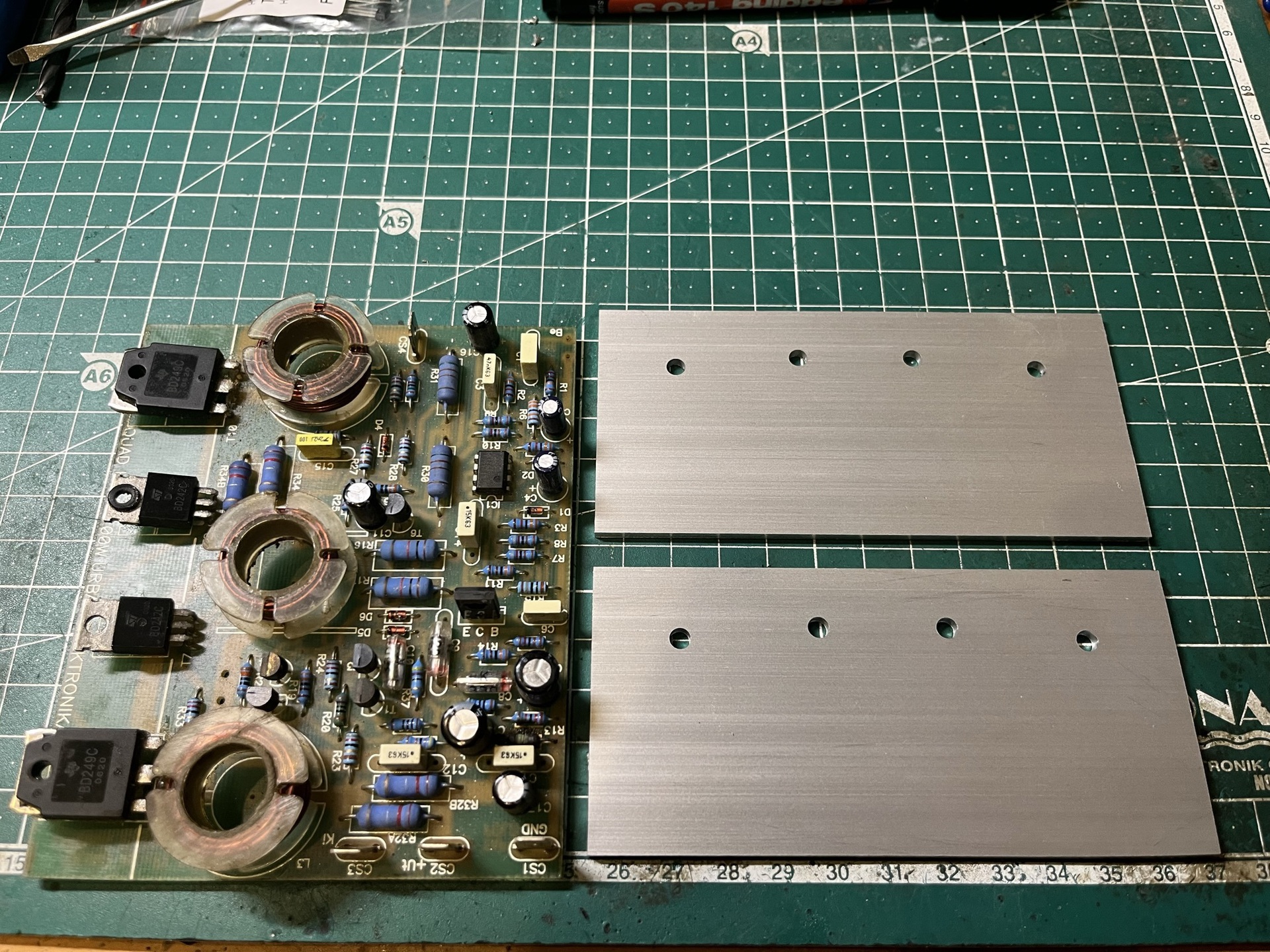 Oké, végülis nem volt vele gondom működésileg, ez tény. Azóta annyi változott csak, hogy nem használok tranzisztoros erősítőt, így 2011 után el lett rakva, és nemrég előkerült. Viszont ami 2007-es éveimben megfelelt nekem mechanikai szerelésileg az ma már nem. Erről van csak szó. Eredetileg úgy volt, hogy csinálok neki egy teljesen új dobozt, viszont munkámból kifolyólag a napokban lett egy gyári erősítő doboz, ami belsőleg "megüresedett", és tökéletesen megfelel neki. A modulon a legfontosabb változtatás a hűtés. A korábbi hűtésen mindenképp változtatni kellett, ezért készült hozzá tegnap két új hűtőlap, amit holnap meghajtok derékszögbe, hogy a hűtőbordára felszerelhető legyen. A tranyókat mint mondtam csak ezért cserélném, mert sajnos a lábakat toldani kéne a vastagabb hűtőlap miatt, ha nem cserélném újakra. Esztétikailag inkább az új, főleg ha nem kerül semmibe. Az IC foglalat és kondicserével meggyőztetek, marad így. A tekercs tekerésen még gondolkodok. Vannak 16mm-es csévéim, mert abban az időben nem csak 6-ot vettem, mivel olcsó volt. Így tudok csinálni egy próbatekerést az eredeti megbolygatása nélkül. Meglátom mennyivel szebb az akkorinál, és ez alapján döntök. A tápon változtatni fogok, és nem középlecsapolású lesz a szekunder. A toroid két szekunderes, így megoldható ez a variáció is. Egyenirányítás, és pufferelés után pont +/- 49-50V a feszültég. Korábban nem volt gondom. Esetleg annyi a végére, hogy érdemes lenne a BD249-et 2SD1047-re cserélni?