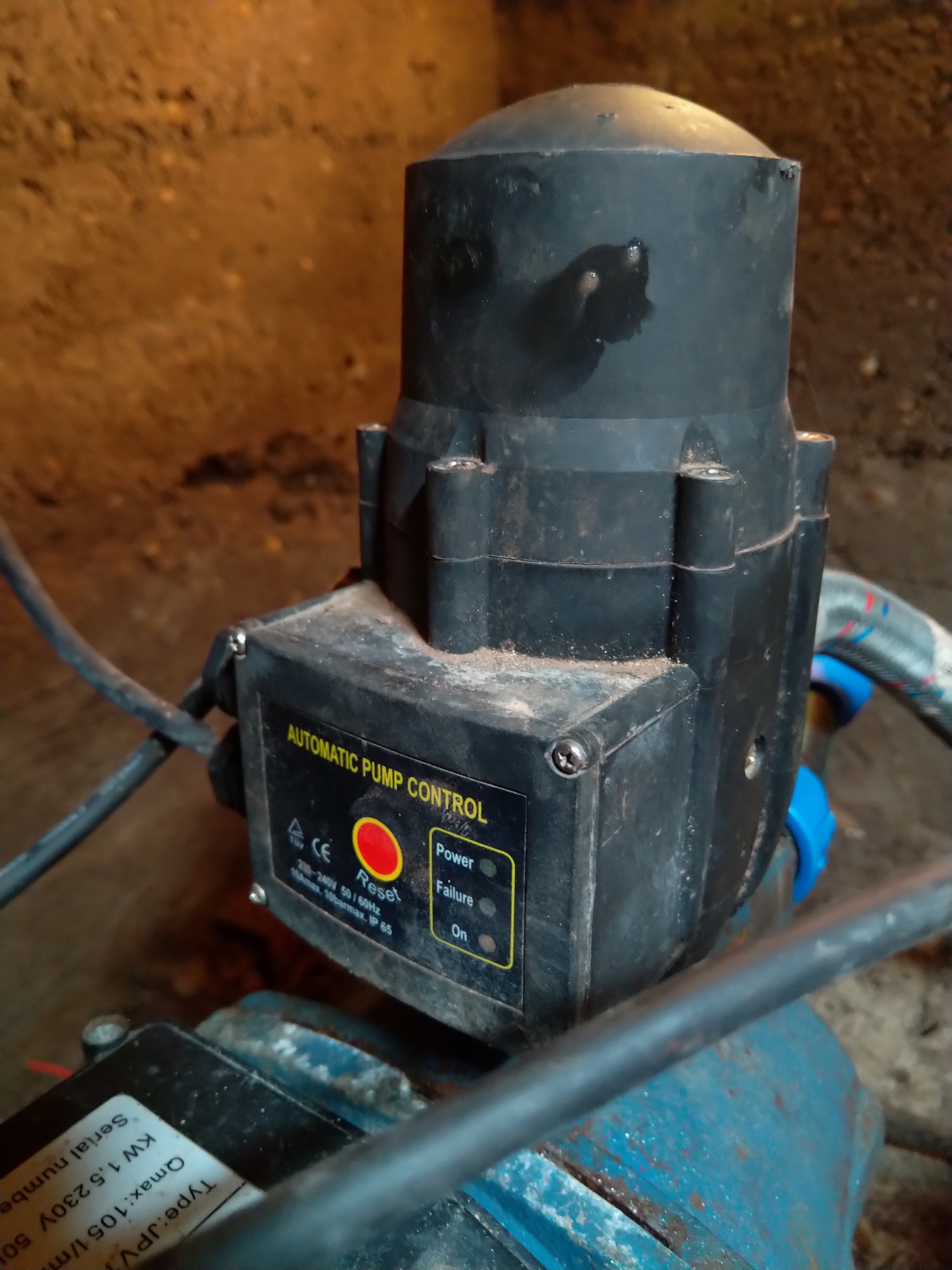 Egy 750W-os búvárszivattyú van rajta 2013 óta. Ha a nyomás 1,5 bar alá csökken, akkor bekapcsol és ha megszűnik az áramlás, akkor ki. (Tehát ekkor a szivattyú által elérhető max. nyomás van.) Van benne szivattyú védelem szárazon futás, túl gyakori kapcsolgatás ellen. (Létezik 0,8 és 2,2 bar indító nyomású változat is.)