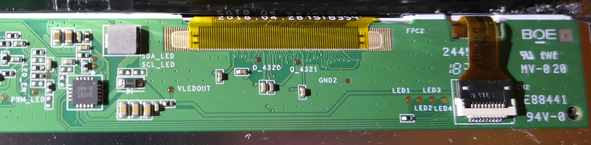 Hacsak nem ez az, ami direktben táplálja a ledeket, akkor meg kevés. A LED OUT is kevés, ezek 20-27V körül szoktak lenni (tipus és képernyőszélesség-függő, hogy hány dióda van sorba kapcsolva). De legalább a stepup működik. Akkor én a ledsorokra tippelnék, valamelyik elszállt, ezért a legrosszabb helyzetre állt be a rendszer, ahol még kialakul az áramablak. Ha tudsz, óvatosan, áramkorláttal állíts be az egyes vonalakon egyenként (ugye 4 van) mondjuk 20mA-t labortáppal. A csati persze ne legyen bedugva. A csati lábainak a kivezetései kellenek legyenek a LED1-4. Ha ott nincs kontakt, az gond. Próbáld meg újra bedugni és mérni, hogy a mérőponthoz képest ad-e kontaktot. A panel másik oldalán nincs semmi vezetékezés? A hozzászólás módosítva: Aug 28, 2023